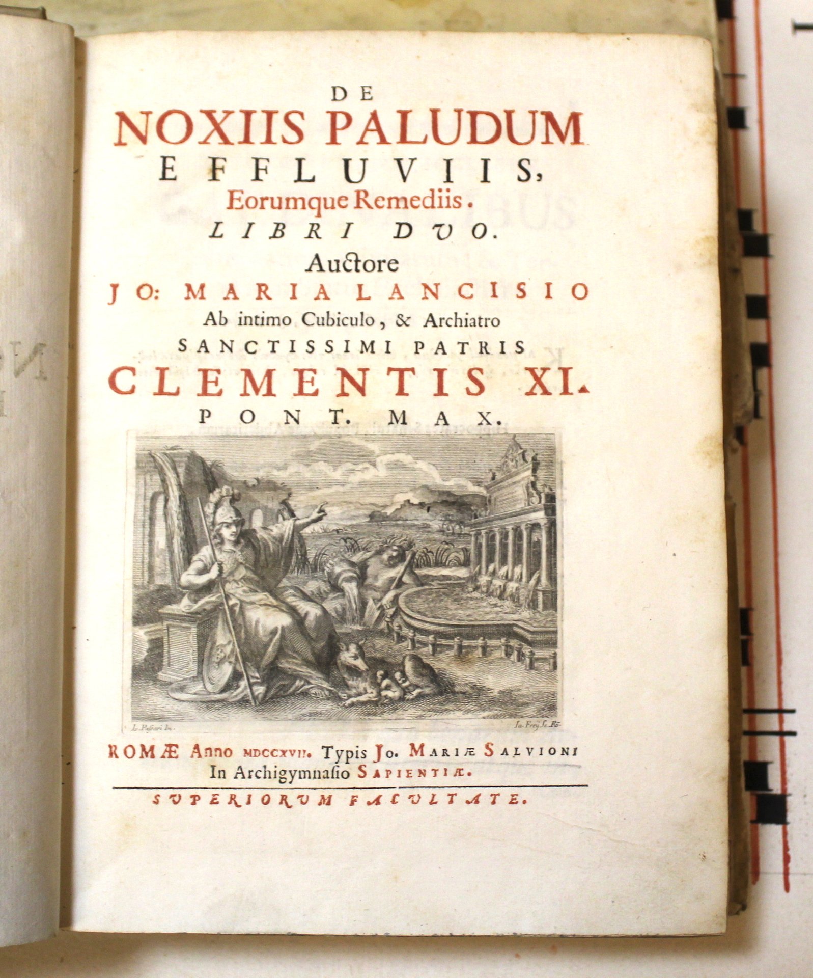 In 4° (mm 235x180) pagg. XXXII, 479, (1). Frontespizio in rosso e nero con grande vignetta in rame su disegno di Io. Passeri raffigurante un'allegoria di Roma; testatine, capilettera istoriati da vignette incise finemente in rame, una grande carta topografica delle paludi Pontine, sempre in rame, incisa dal Frezza f.t. ripiegata più volte, arricchita da una rosa dei venti, due legende in basso. Piena pergamena rigida coeva con titolo manoscritto al dorso, tagli marmorizzati. <BR>Prima rara edizione di un'opera medica assai importante, scritta da Giovanni Maria Lancisi, (Roma 1654 - 1720) medico di grande fama, archiatra di Clemente XI e medico del conclave, fondatore della nobile Accademia di Medicina e Chirurgia (ancora oggi attiva ), dove il Lancisi presentò il discorso di etica professionale sul "Medico perfetto". Durante la sua carriera fu medico all'ospedale di Santo Spirito e professore di anatomia alla Sapienza. Acquistò fama europea con l'opera "De Subitaneis mortibus"del 1706, considerato tuttora un importante trattato di cardiologia. Egli apportò con i suoi studi e ricerche un grande contributo scientifico sulla malaria: fu il primo ad intuire che la causa della malaria erano le zanzare ed erano pure il veicolo di diffusione, insetti che provenivano principalmente dai canali di scolo e dai territori alluvionati. Assai interessante la bella carta geografica che presenta più di venticinque rimandi esplicativi.<BR>Ottimo esemplare genuino e fresco, stampato su carta vergellata. Presenta minime saltuarie fioriture. Piccoli difetti agli spigoli.<BR>DSBVII; pag. 613-614; Garrison &Morton5232; Wellcome III, 441. <BR><BR>