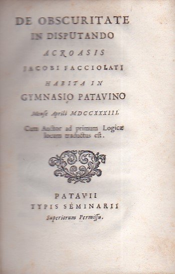 In-8°, pp. XXXII, brossura marmorizzata ottocentesca. Dedica a stampa al patrizio veneto Giovanni Emo. Bruniture e aloni alle ultime cc. Unica edizione di questa dissertazione letta nel Ginnasio padovano. Jacopo Facciolati (Torreglia, 1682Padova, 1769) fu poeta, lessicografo, filologo e latinista, professore di logica all'Università di Padova. Curatore di edizioni del Thesaurus Ciceronianus del Nizolio e del Lexicon Septem Linguarum del Calepino, per i suoi numerosi lavori dedicati alla lingua latina (maggiore tra tutti il 'Totius Latinitatis Lexicon', realizzato con il Forcellini) raggiunse notorietà europea, al punto da essere espressamente invitato a Lisbona dal Re del Portogallo.