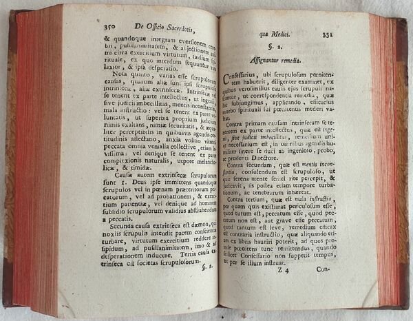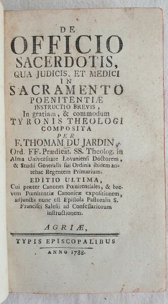 Interessante raccolta di due opere legate insieme nello stesso volume entrambe stampate ad Agria in Grecia. La prima del 1788 sull'officio dei sacerdoti nel sacramento della penitenza scritto da Thomas du Jardin. La seconda del 1789 un istruzione del Cardinale Carlo Borromeo Arcivescovo di Milano sulla confessione. Testo latino. In ottime condizioni. Copertina in mezza pelle coeva in buone condizioni generali con lievi usure ai margini e dorso. Legatura in buone condizioni. All'interno le pagine si presentano in buone condizioni con fioriture. In 8. Dim. 19x12 cm. Pp. (8)+408+(8)+99+(5).Interesting colelction of two works bound together in a unique volume both published in Agria in Greece. The first one in 1788 about the officve of priests in the sacrament of penitence written by Thomas du Jardin. The second one of 1789 an instruction of the Cardinal Carlo Borromeo Archibyshop of Milan about confession. Latin text. In very good conditions. Half leather coeval cover in good general conditions slightly worn in the edges and spine. Binding in good conditions. Inside pages are in good conditions with foxings. In 8. Dim. 19x12 cm. Pp. (8)+408+(8)+99+(5).