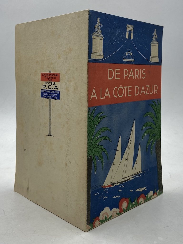 Pieghevole cm 19x13 (chiuso), singolo foglio cm 39x26 stampato a colori, su un lato una carta turistica dell’itinerario Parigi - Costa Azzurra con indicazione degli Alberghi del consorzio HOLTES PCA (Paris Cote d’Azur), sull’altro le due facciate di copertina e l’elenco degli alberghi. Illustrazione sul piatto anteriore (una volta richiuso) firmata Marcel-Jacques Hemjic (1894-1942).