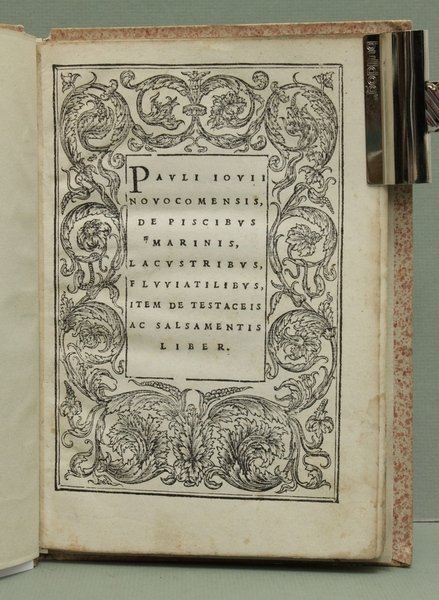 In - 4°; 44 cc. nn., titolo inquadrato in bella cornice xilografica; legatura in tutto cartone rigido della fine del '700. Rare gore e fioriture marginali. Prima edizione in - 4° e seconda assoluta dopo quella in - folio del 1524, stampata nel bel carattere corsivo del tipografo Minizio Calvo originario di Menaggio sul lago di Como. Il titolo è inquadrato in una larga bordura xilografica con soggetti fitomorfici. L'opera tratta della natura dei vari pesci e per la descrizione di quelli d'acqua dolce: tinca, trota, anguilla, persico ecc. l'autore si basa su informazioni che aveva raccolto anche sul lago di Como. In questa interessante opera, che godette di larga fama e di molte edizioni in Europa, all'aspetto più squisitamente ittico si aggiunge quello gastronomico. Di notevole interesse anche l'accenno alla scoperta dell'America al verso della carta D1. EDIT on - line 21145. BING 952.