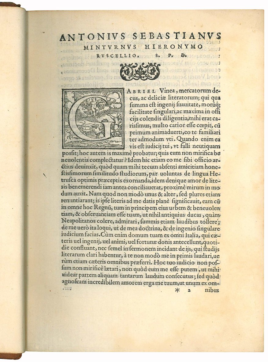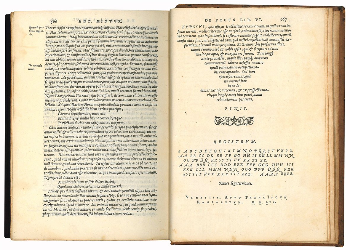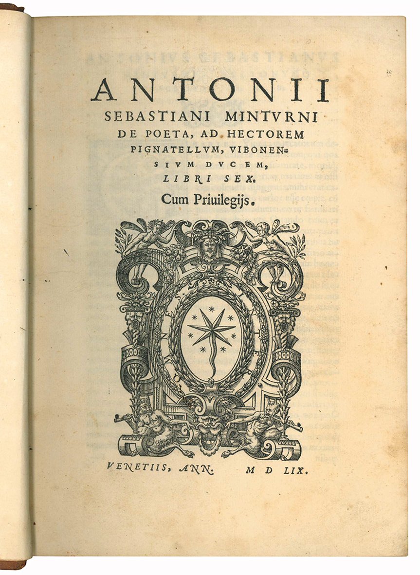First edition. “In comparison with its fairly short, fairly meager, fairly single-minded predecessors, Antonio Sebastiano Minturno's De poeta (1559) is a colossus among ‘artes poeticae'. The six books of dialogue make an aggregate of almost six hundred pages. Besides, rather than drawing almost exclusively upon the Ars poetica, the work incorporates (in addition to Horace) almost all of the Poetics and abundant materials from Plato (Republic, Laws, Ion, etc.), from Aristotle's Rhetoric, from Quintilian, and from all the rhetorical writings of Cicero. It is thus the first of the really extensive arts of poetry, the first to attempt a detailed discussion of every aspect of doctrine and technique, the first to broaden considerably the range of references and ‘authorities'. These features are not without important consequences for the nature of the work itself; for they give to it a wide-ranging eclecticism, which is reflected in the theory ultimately evolved by Minturno […] From the way these various distinctions are developed, from the miscellaneous shutting off in the directions of the poet or nature or the poem or the audience, it should be clear the Minturno's treatise remains primarily eclectic and syncretic. None of the term of ultimate reference comes to dominate the others, to impose a systematic organization upon the work. Insofar as there is any ordering of ideas, it is an ordering to rhetorical principles. At one end of each of the chains of relationship is an effect upon the audience; at the other end, some faculty of the poet capable of producing that effect; in the middle, the poem serving as a means or instrument […] For Minturno, the poet, his art, and his faculties occupy a similar position of pre-eminence. What Minturno does, essentially, is to take over the whole rhetorical schematism of his times, to substitute for the orator the poet, and to introduce - at what seemed to him to be the most likely points in the argument - all the know materials on the art of poetry. In this way both the Poetics and the Ars poetica are, if not assimilated, at least incorporated into a vast compendium on the art” (B. Weinberg, A History of Literary Criticism in the Italian Renaissance, Chicago-Toronto, 1961, pp. 737-743).