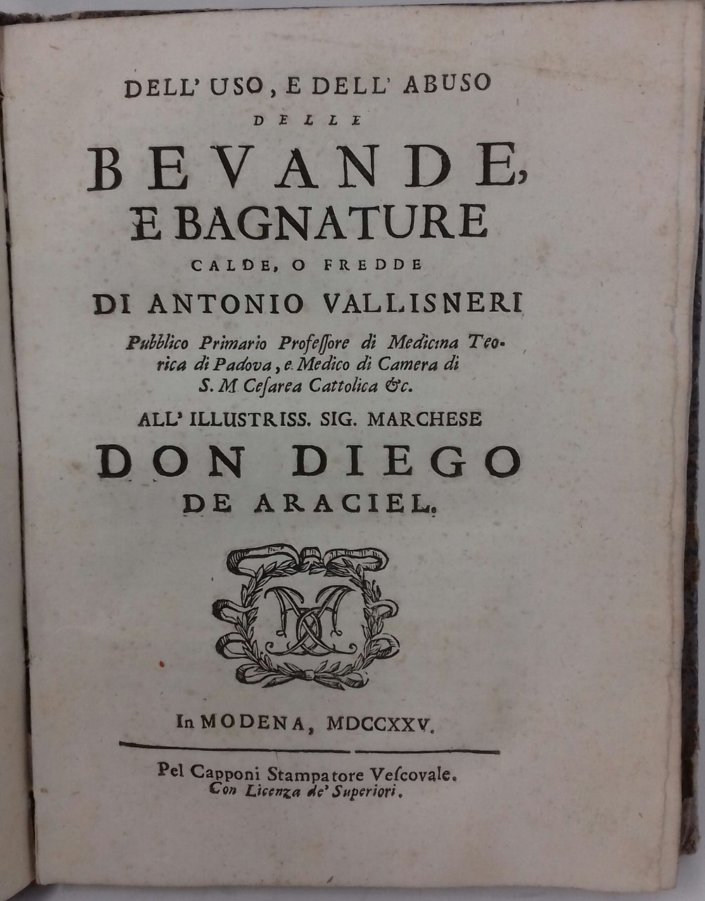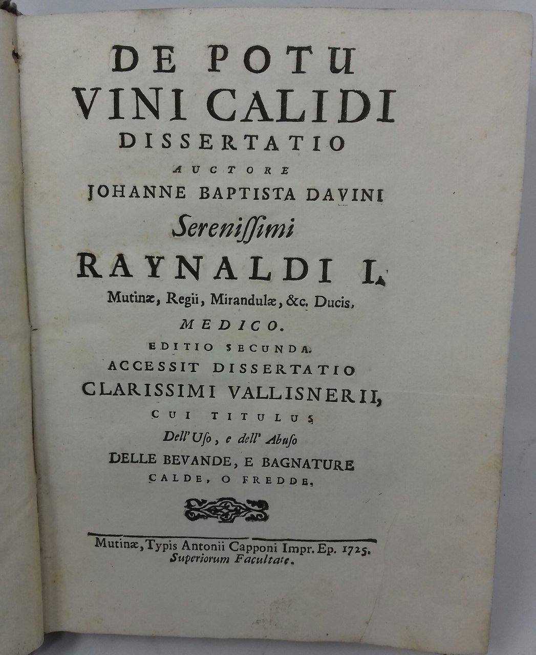 De Potu Vini Calidi dissertatio... Editio secunda. Accessit Dissertatio clarissimi Vallisnerii cui titulus Dell’uso e dell’abuso delle Bevande e Bagnature calde o fredde.