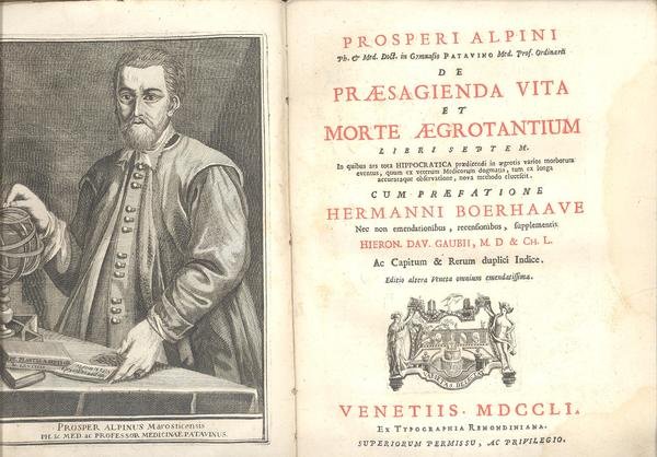 IN 4° piccolo, pp. ( 2 ), XII, 314. COPERTINA EDITORIALE CARTONE FLOSCIO. IN ANTIPORTA, RITRATTO DI PROSPER ALPINUS MAROSTICIENSIS, INCISO. PREFAZIONE DI HERMANNI BOERHAAVE. TESTATINA INCISA. PROSPERI ALPINI ( 1553 - 1617 ), MEDICO E BOTANICO. DAL 1580 al 1584 FU IN EGITTO AL SEGUITO DI GIORGIO EMO, PATRIZIO VENETO CONSOLE AL CAIRO. DAL 1603 PREFETTO DELL'ORTO BOTANICO DI PADOVA. A SEGUIRE, HIERONYMI FRACASTORII VERONENSIS, " DE DIEBUS CRITICIS ". STAMPATO SEMPRE A VENEZIA NEL 1751, pp.( 1 ),16 + pp. 20 DI INDICI. NEL PRIMO RISGUARDO, ARTISTICO CARTIGLIO CON IL NOME DEL POSSESSORE. ALONI MARGINALI NELLE PARTI BIANCHE CHE NON LEDONO IL TESTO, PICCOLA MANCAZA DI CARTA AL DORSO NELLA PARTE DI TESTA, ALTRIMENTI OTTIMA CONSERVAZIONE GENERALE. COMPLETO DELLE DUE PARTI. RARO. ID, 6019