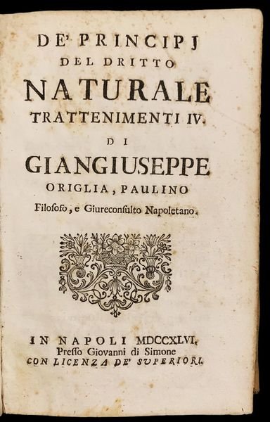 De Principj del Diritto Naturale trattenimenti IV. di Giangiuseppe Origlia, Paulino, Filosofo, e Giureconsulto Napoletano.
