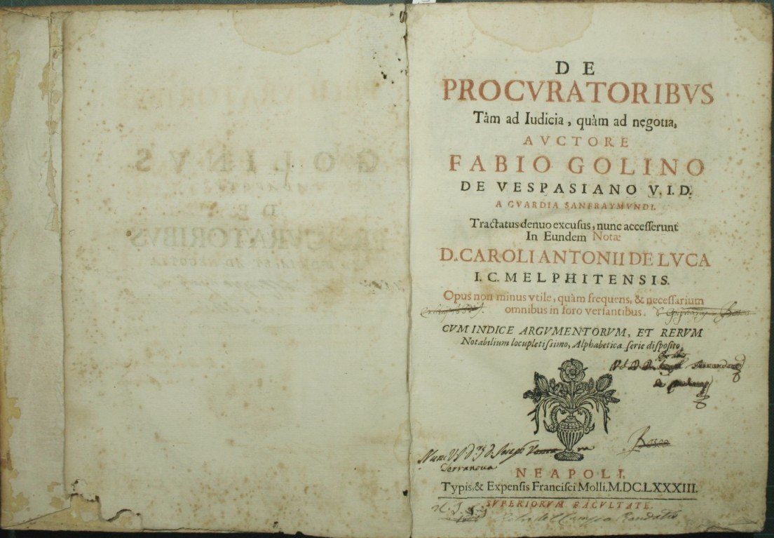 Auctore Fabio Golino de Vespasiano V.I.D. a Guardia Sanfraymundi. Tractatus denuo excusus, nunc accesserunt in eundem notae D. Caroli Antonii de Luca I.C. Melphitensis - Opus non minus vtile, quam frequens, & necessarium omnibus in foro versantibus. Cum indice argumentorum, et rerum notabilium locupletissimo, alphabetica serie disposito - in 4° - pp.6 cc. nn. + 280 + 16 cc. nn. - Pergamena - Fregio al frontespizio, incisione alla prima p., testatine e capilettera - Frontespizio in rosso e nero, testo su due colonne - Legatura staccata, nota di possesso a inchiostro all'occhiello e al frontespizio, fioriture alle pagine