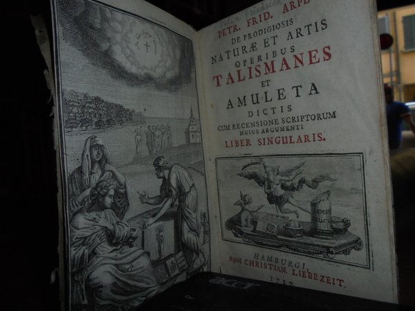 PETR. FRID. ARPE. De prodigiosis naturae et artis operibus talismanes et amuleta dictis cum recensione scriptorum huius argumenti liber singularis. Hamburgi, Apud Christian Liebezeit, 1717. In- 8°, br. muta. (viii), 184, (16) pp. con antiporta allegorica e vignetta nel frontespizio incisa in rame. Carta con lievi arrossature. Edizione originale ed unica di questa rarissima opera bio-bibliografica inerente ai talismani e agli amuleti. Manca al Cat. St. de Guaita e al Dorbon. Contient des remarques sur environ 550 auteurs et ouvrages occultes, dont le Catalogue alphabétique termine le volume. (Caillet, I, 446). Graesse, Bibliotheca magica et pneumatica, p. 39. Rosenthal, Bibliotheca magica et pneumatica, 1814. Non citato dal Besterman. Cas