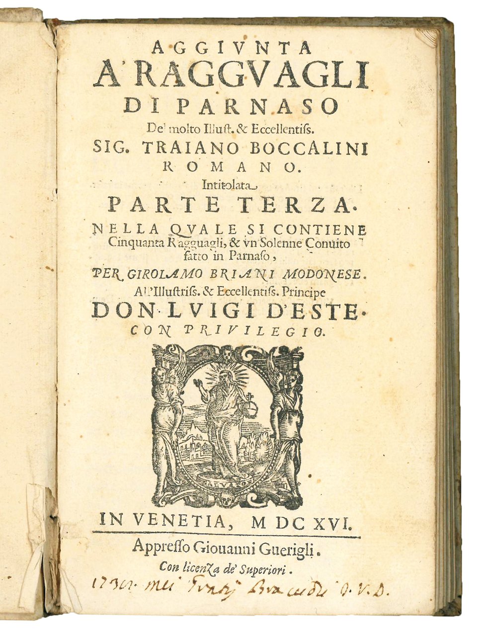 BRIANI, Girolamo (1581-1646). Aggiunta a' Ragguagli di Parnaso del molto Illust. & Eccellentiss. Sig. Traiano Boccalini cittadino romano. Intitolata parte terza, nella quale si contengono cinquanta ragguagli, & un solenne convito fatto in Parnaso, per Girolamo Briani cittadino modonese. Venice, Giovanni Guerigli, 1616.
