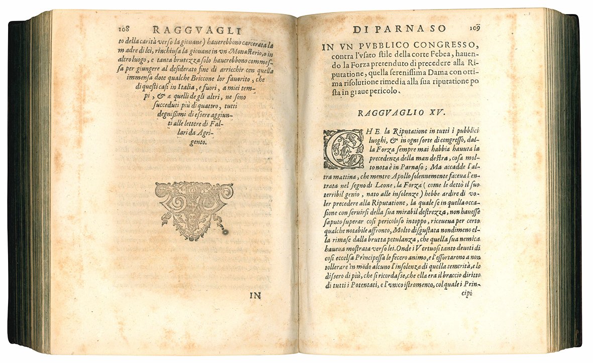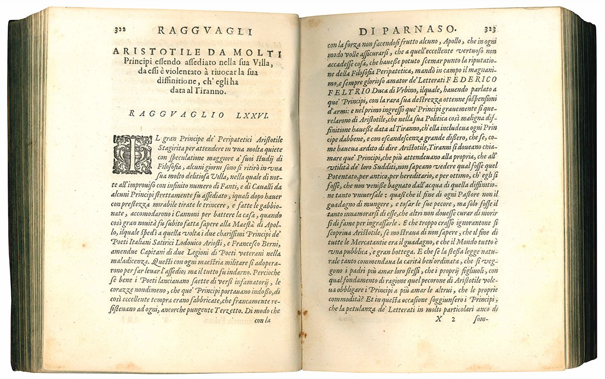 Fourth edition of Centuria prima and third edition of Centuria seconda of De' Ragguagli di Parnaso. Reissue of the first edition of the Pietra del paragone politico.