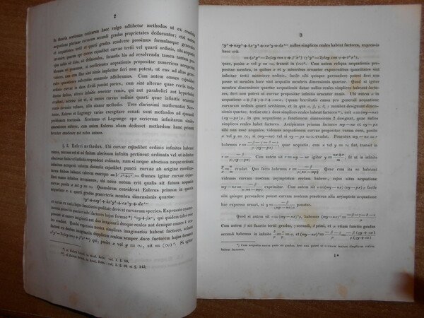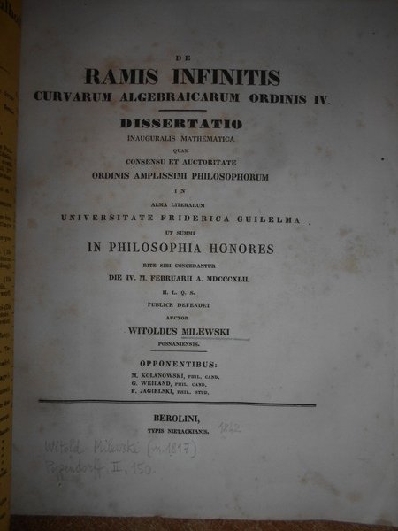 DE RAMIS Infinitis curvarum algebraicarum ordinis IV Dissertatio inauguralis mathematica quam consensu et auctoritate ordinis amplissimi philosophorum in alma literarum Universitate Friderica Guilelma ut summi in Philosophia Honores rite sibi concedantur die IV M. Februarii A. MDCCCXLIL. Witoldus, Milewski (n. 1817). Berolini, Typis Nieatackianis, 1842. Edizione originale con segnalibro in cotone. In-8° grande, br. muta. iii, 81, (2) pp. A parte qualche arrossatura in alcune pp. esemplare ben conservato. Poggendorff, II, 150. Neg. pacco 2 Valla e opuscoli nonn.