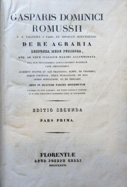 Florentiae, Apud Joseph Gelli (Josephum al secondo frontespizo), 1836 - 1837. Editio secunda. Due tomi in unico volume in folio, pp. VIII, 832 (con Index Rerum), a numerazione continua, testo latino su due colonne, leg. in cartonato con dorso in perg. rigida e titolo ms. Seconda edizione di questo celebre testo di diritto agrario che raccoglie numerose norme e decisioni di ambito giuridico-agrario e che fu edito per la prima volta a Parma nel 1768. Buono stato di conservazione.