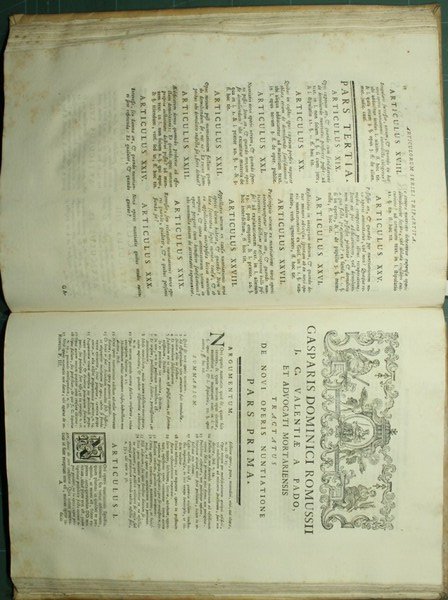 Accedunt insuper et alii Tractatus, nempe, de Unionibus, Rerum Unicitate, atque Pluralitate, de Novi operis nuntiatione, et de Precario. Opus in quatuor partes distributum - Universis ne dum judicibus sed etiam causarum patronis et in foro versantibus summopere utile ac necessarium - in 4° - pp.VIII + 164; IV + 54; IV + 53; IV + 48 - Pergamena - Marca tipografica al frontespizio con monogramma, testatine e capilettera - Prima edizione. Testo su due colonne. Ampi margini e carte fresche - Nota di possesso a inchiostro al frontespizio