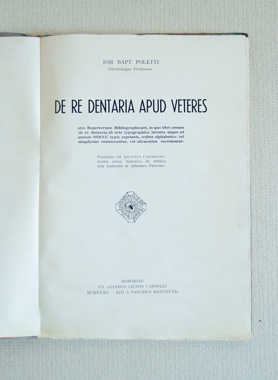 PRIMA EDIZIONE. Brossura originale un po' sciupata. Internamente molto buono. VIII, 126 pp. Con tavv. F.t. e illustrazioni. Basilare bibliografia sull'odontoiatria dalle origini della stampa sino a tutto il 1800. Prefazione di Arturo Castiglioni.
