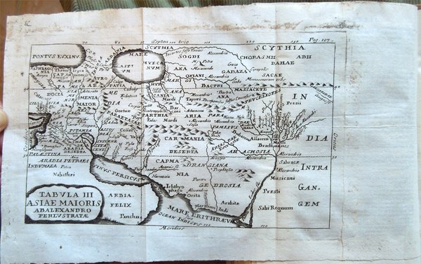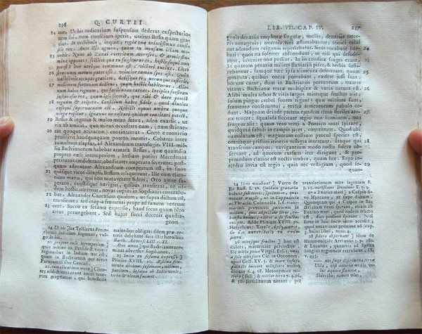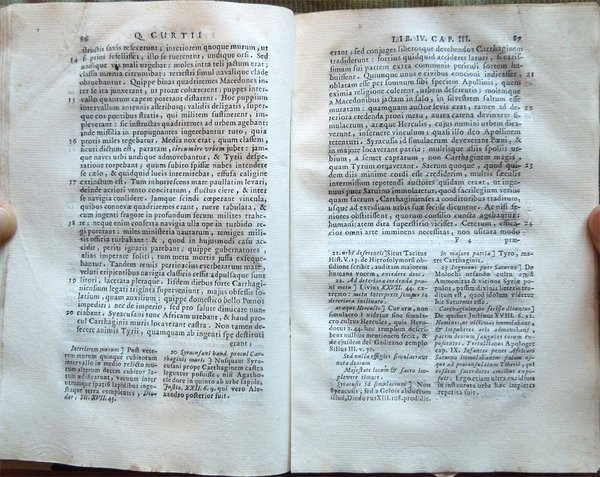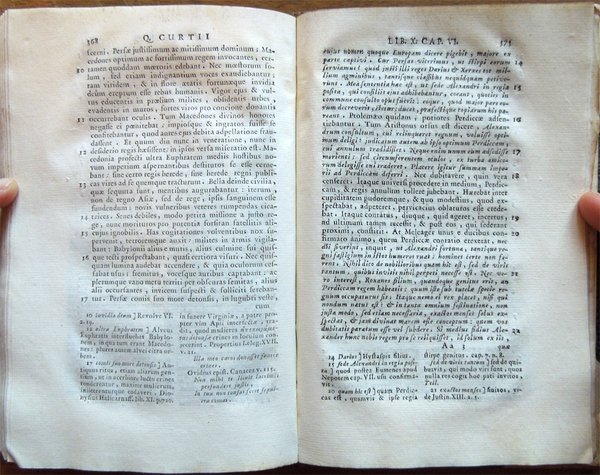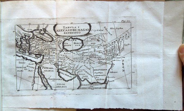 In-16° (18,7 x 12,4 cm), pp. 431, (1), legatura successiva in mezza pergamena con titoli su tassello al dorso. Normali tracce d'uso e del tempo alla legatura. Alcuni, piccoli, leggeri segni d'umido ai tagli. Con tre tavole fuori testo più volte ripiegate raffiguranti "Alexandri Magni expeditio", "Graeciae et Asiae Minoris" e "Asiae Maioris ab Alexandro perlustratae". Il fascicolo Aa, per un errore del rilegatore, risulta male impaginato (dettaglio: Aa3, Aa4, Aa, Aa2, ma è assolutamente completo), per il resto ottimo e fresco esemplare. Poche le notizie su Quinto Curzio Rufo, storico latino del I secolo d.C. Identificabile, forse, con l'omonimo retore ricordato da Svetonio, scrisse, appunto, al tempo di Claudio, o secondo altri di Vespasiano, una storia di Alessandro Magno in dieci libri (Historiarum Alexandri Magni libri X), dall'inizio della sua spedizione in Asia Minore (334 a.C.) fino alla morte (323 a.C.). L'opera, giunta a noi mutila del I e II libro e con lacune al V, VI e al X, si rifà a fonti greche di tendenza diversa (Clitarco, Callistene, Aristobulo, Timagene, ecc.) per lo più amalgamate in una narrazione drammatica, ricca di colore e di motivi patetici, intessuta di riflessioni moralistiche e di precisazioni psicologiche, con grande attenzione per l'elemento meraviglioso e miracoloso. Ne deriva una figura di Alessandro in cui non vengono poste in risalto le sue qualità di condottiero esperto e di politico lungimirante, ma, in particolare, viene esaltata quella di guerriero prodigioso, alla perenne ricerca di gloria e di nuove conquiste.