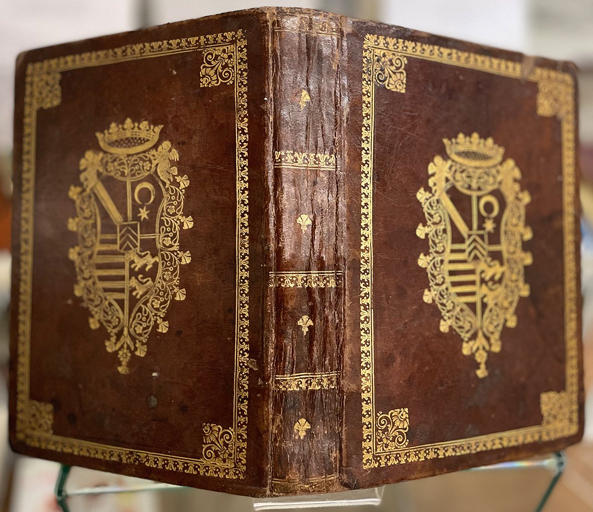 (Ischia- Legatura- Ediz.’600) IASOLINO Giulio. De Rimedi naturali che sono nell’Isola di Pithecusa; hoggi detta Ischia. Libri due nelli quali si dimostrano molti rimedi naturali, dal detto Autore nuovamente ritrovate, oltre quelli, che lasciarono scritti gli Antichi. Con due figure e Pianta della detta Isola e due tauole copiose. Et in questa seconda impressione ricorretto, & accresciuto con alcune annotationi del Dottor Filosofo Sig. Gio: Pistoya. E nell’ultimo aggiunti li bagni d’Ischia di Gio: Elisio Medico Napoletano, con le note di Gio: Francesco Lombardo, Medico Napoletano. Napoli, Mollo, 1689. In-4°, splendida legatura alle armi in piena pelle chiara con fregi in oro al d. e grosso stemma nobiliare inciso in oro ai piatti dentro eleganti cornici dorate; cc. 20 nn.-pp. 274+19 cc. nn. (Tavola delle infermità, ...quali si curano con l’uso de’ Rimedij naturali d’Ischia)+14 pp. num. (Aenariarum Balnea ex Ioanne Elysio...) con due belle tavole f.t. . Alcune pagine brunite. Rarissimo.