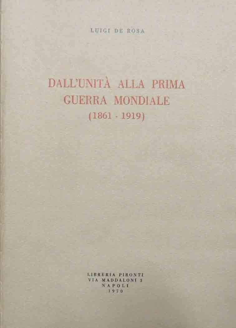 Luigi De Rosa, Dall’Unità alla prima guerra mondiale (1861-1919). Momenti e problemi dello sviluppo economico italiano, Libreria Pironti, Napoli 1970, pp. 358, cm 24, br. ed. Pubblicazione ciclostilata. Firma d’appartenenza e data al frontespizio. Minime tracce d’uso alla brossura, alcune lievi sottolineature a lapis, per il resto perfetto.