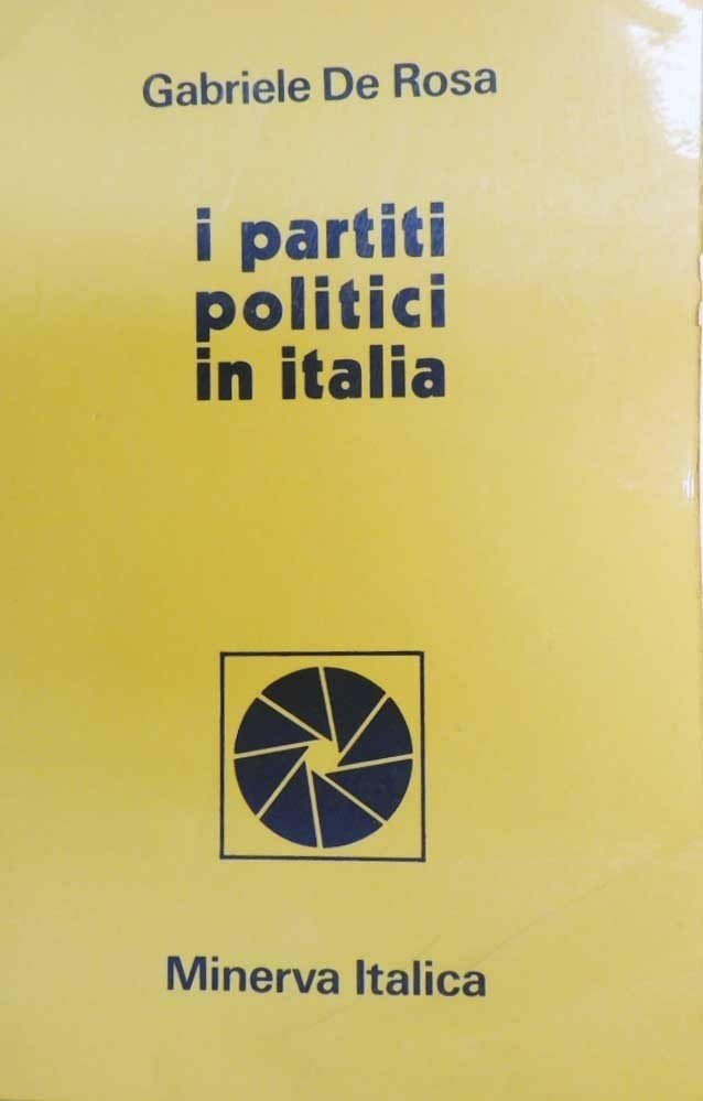 Gabriele De Rosa, I partiti politici in Italia, Minerva Italica, Bergamo 1972, prima ed., pp. 530, cm 22, br. ed. Indice: Premessa – L’anarchia – Il Partito Socialista rivoluzionario di Romagna – Il Partito Operaio Italiano – Il Partito Socialista Italiano – Dalla democrazia cristiana al Partito Popolare Italiano – Il Partito Repubblicano Italiano – Il Partito Nazionale Fascista – Il Partito Comunista Italiano – Da Giustizia e Libertà al Partito d’Azione – Il Partito Liberale Italiano – La Democrazia Cristiana (1943). Timbro “Omaggio” perforato alla quarta di copertina. Minime tracce d’uso alla brossura, normali segni del tempo, per il resto ben conservato.