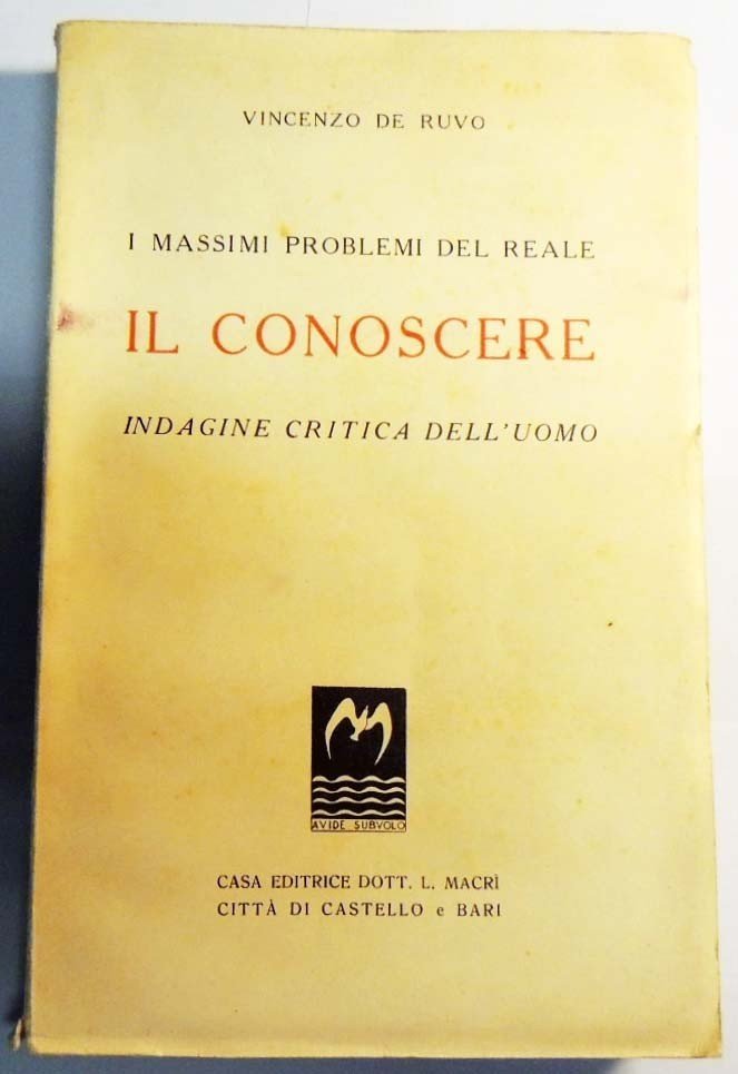 Vincenzo De Ruvo, I massimi problemi del reale. Il conoscere. Indagine critica dell’uomo, Casa Editrice Dott. L. Macrì, Città di Castello-Bari 1946, pp. 269, cm 23, br. ed. Intonso. Raro.