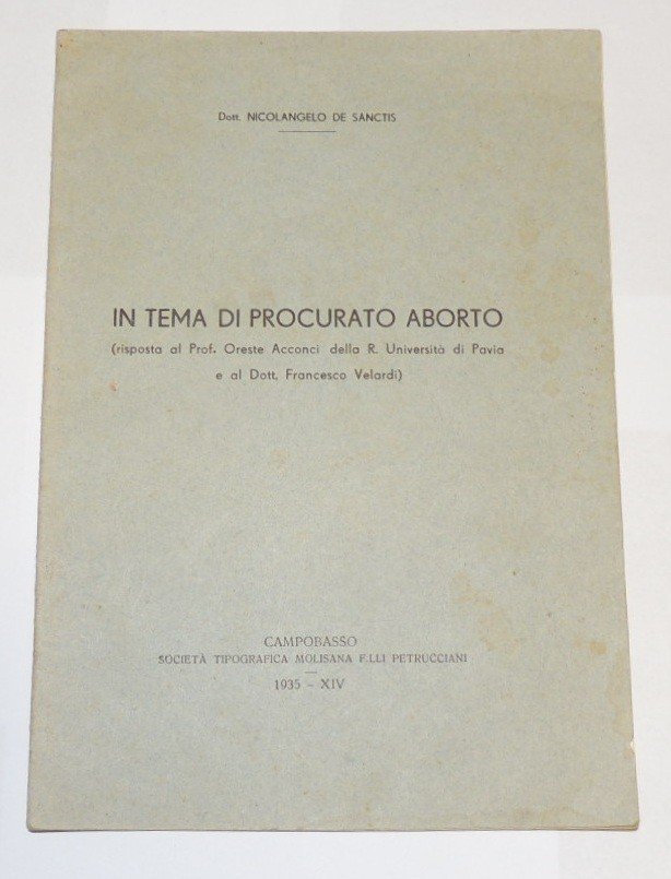 Nicolangelo De Sanctis, In tema di procurato aborto. Risposta al Prof. Oreste Acconci della R. Università di Pavia e al Dott. Francesco Velardi, Società tipografica Molisana f.lli Petrucciani, Campobasso 1935, pp. 22, cm 25. Buon esemplare.