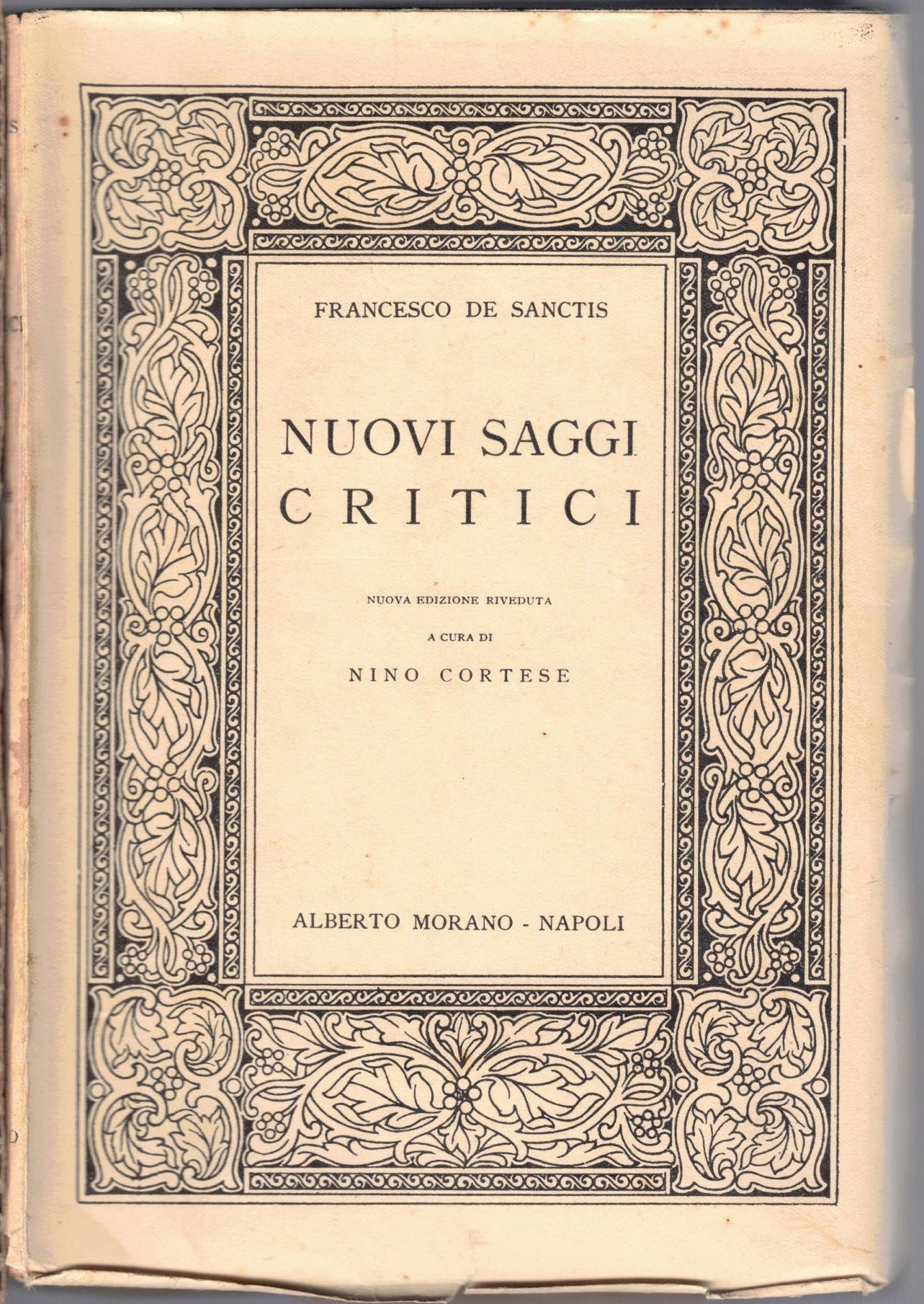 Francesco De Sanctis, Nuovi saggi critici, nuova ed. a cura di Nino Cortese, Alberto Morano Editore, Napoli 1933, pp. 407, cm 21, br. ed. Indice: Francesca da Rimini – Il Farinata di Dante – L’Ugolino di Dante – Settembrini e i suoi critici – Machiavelli – La prima canzone di Giacomo Leopardi – L’uomo di Guicciardini – Un dramma claustrale – Ugo Foscolo – Giuseppe Parini – La scienza e la vita – Giovanni Meli – Il principio del realismo – La Nerina di Giacomo Leopardi – Le nuove canzoni di Giacomo Leopardi. Leggere tracce d’uso alla brossura, una piccola mancanza al dorso, ordinari segni del tempo, per il resto esemplare ben conservato, con interno pulito e ben tenuto.