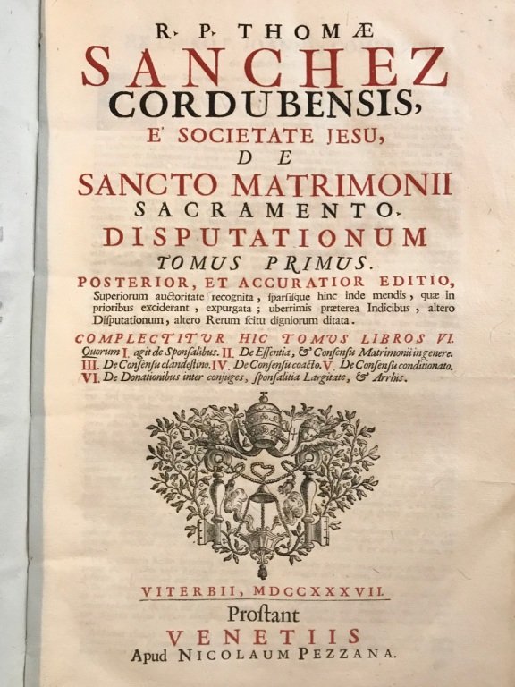 <span style="font-style: normal;">3 volumi in 2 tomi in-folio reale (cm. 39), legature coeve in cartonato d'attesa; pp. [76] 380, 308, 314 in barbe, con primo frontespizio in rosso e nero; lievi fioriture sparse. Opera all'Indice per aver postulato l'assenza di figli come qualità invalidante il matrimonio; opera altresì nota per la </span>dovizia di particolari con cui il gesuita andaluso si era addentrato nell'intimità coniugale fino a sfiorare l'osceno <span style="font-style: normal;">(al dorso </span><i>Biliotheca Veneris</i><span style="font-style: normal;">). Cfr. F. Alfieri, </span><i>Nella camera degli sposi. Tomás Sánchez, il matrimonio, la sessualità (secoli XVI-XVII)</i>, Il Mulino 2010; Graesse VI, 259. Esemplare molto buono. (SC3)<div style="font-style: normal;"> .</div>