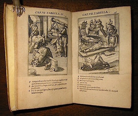 8vo (cm. 15,4), 24 cc.nn. (compreso il frontespizio interamente inciso e 17 tavv. numerate incise su rame da disegni di Antonio Tempesta con legenda sottostante l’illustrazione), 376 pp., 20 cc.nn. (Indice). Legatura coeva in pergamena con unghie. Titolo manoscritto al dorso (poco leggibile).Taglio superiore colorato. Esemplare nel quale - rispetto alle bibliografie di riferimento - non sembra siano state inserite ‘ab origine’ le tavv. numerate da 18 a 25. Ottimo stato di conservazione, salvo alcune bruniture della legatura. Prima edizione stampata in Germania dell’opera del Gallonio, pubblicata la prima volta in Roma nel 1594.