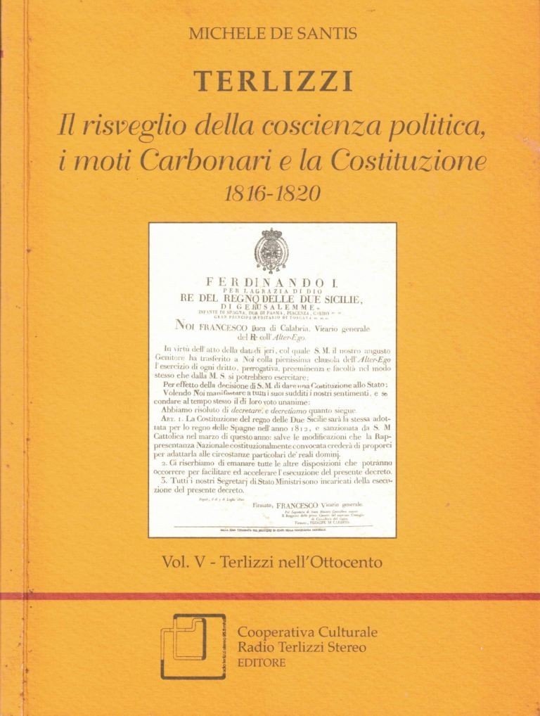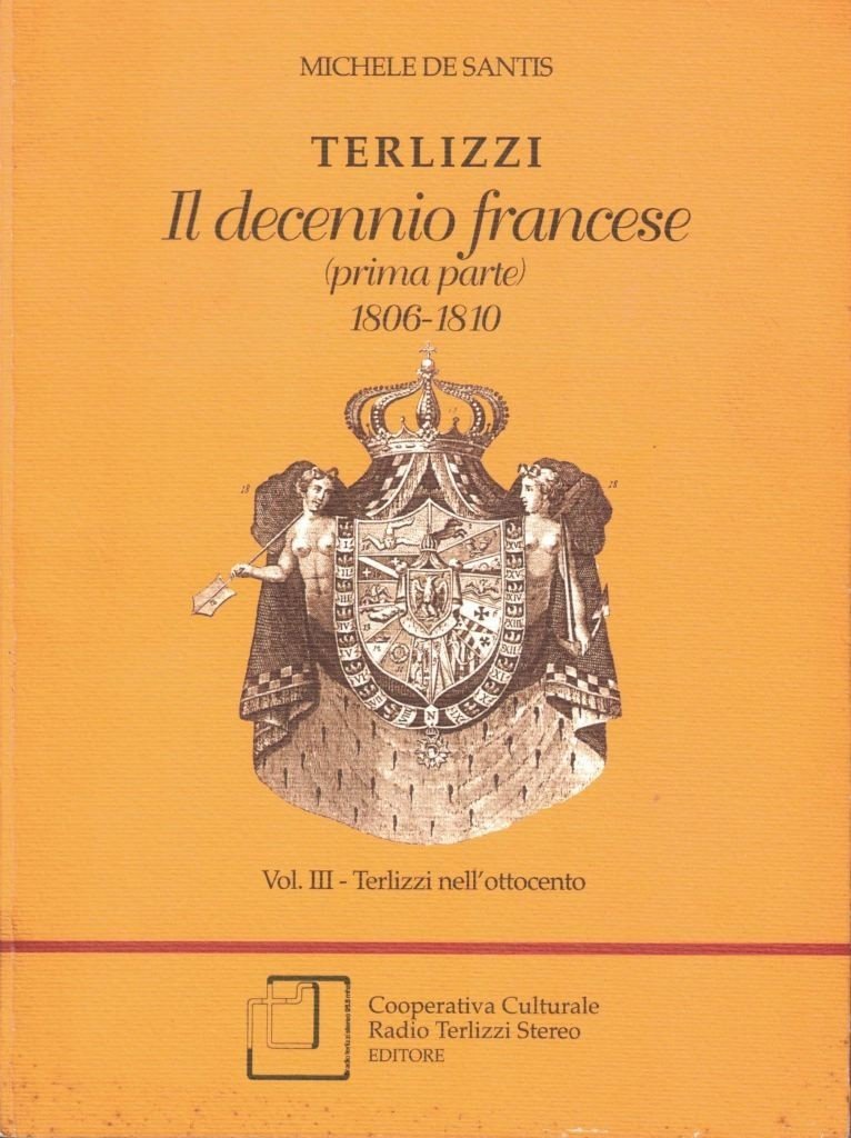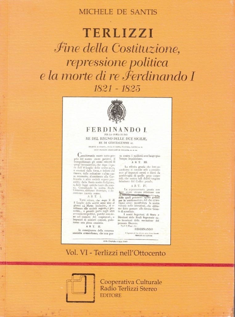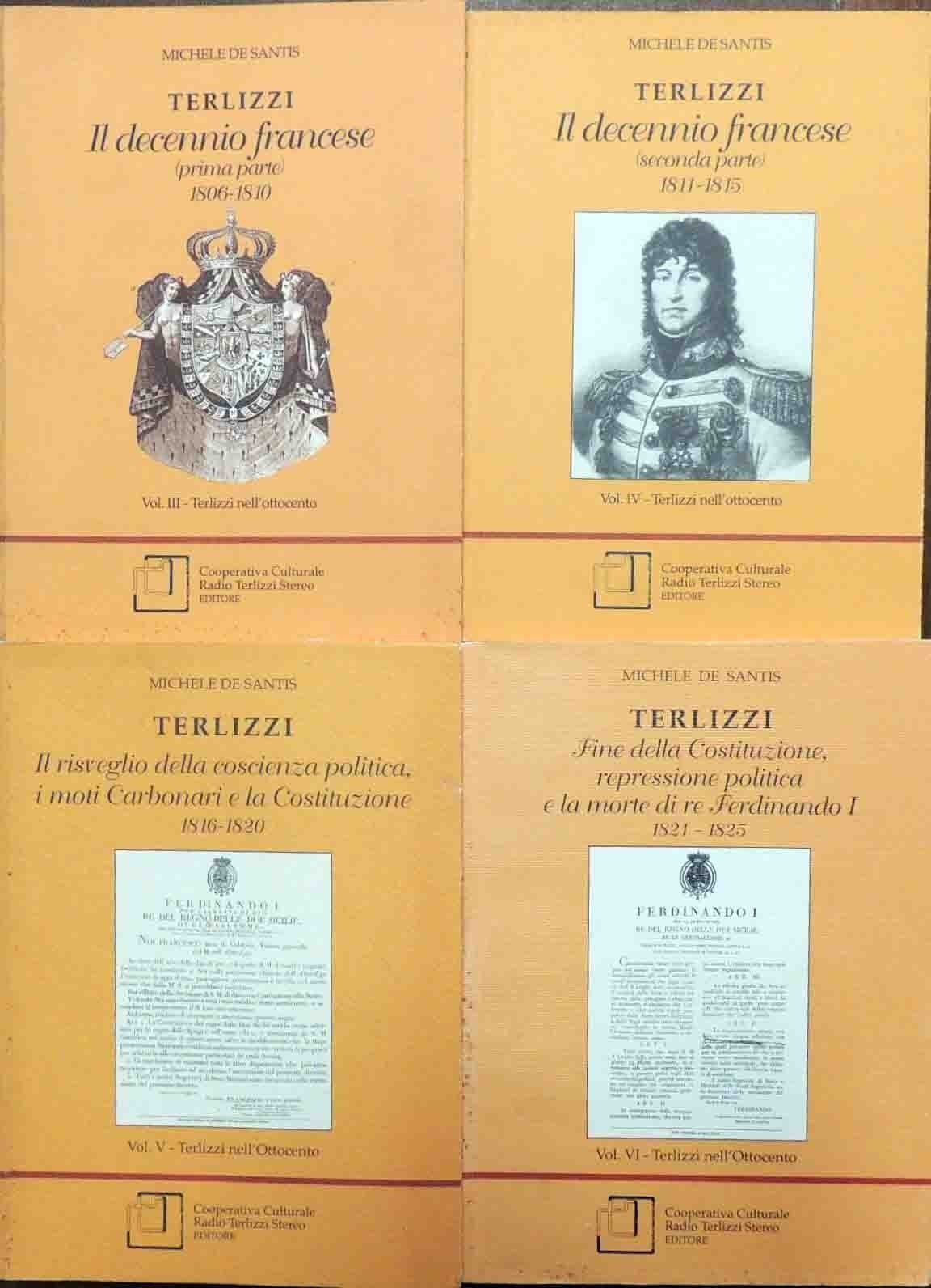 Michele De Santis, Terlizzi nell’Ottocento, Cooperativa Culturale Radio Terlizzi Stereo Editore, Terllizzi 2000-2006, pp. 1427, ill. b.n., cm 21, br. ed. Il lotto comprende i volumi III-VI (per un totale di 4 voll.) dell’opera monografica di Michele De Santis dal titolo Terlizzi nell’Ottocento. Segue dettaglio dei singoli volumi. Vol. III. Terlizzi. Il decennio francese. Prima parte. 1806-1810, Terlizzi 2000, pp. 294 – Vol. IV: Terlizzi. Il decennio francese. Seconda parte. 1811-1815, Terlizzi 2002, pp. 299 – Vol. V: Terlizzi. Il risveglio della coscienza politica, i moti carbonari e la Costituzione. 1816-1820, Terlizzi 2004, pp. 430 – Vol. VI: Terlizzi. Fine della Costituzione, repressione politica e la morte di re Ferdinando I. 1821-1825, Terlizzi 2006, pp. 404. Tutti i volumi fanno parte della collana Terlizzi nel tempo. Timbro Copia Omaggio al frontespizio del vol. 3. Minime fioriture alle brossure, lievi tracce d’uso, per il resto perfetti.