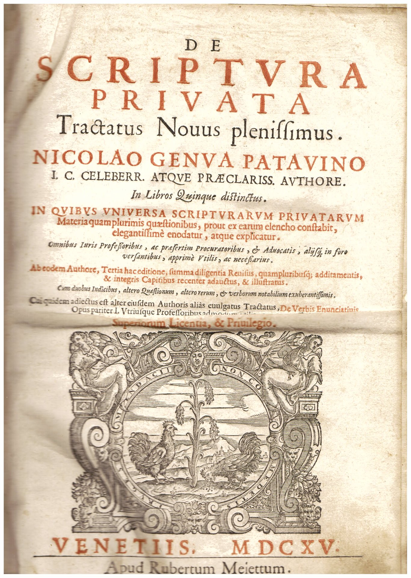 De Scriptura Privata Tractatus Novus plenissimus. In Libros Quinque distinctus. In quibus universa scripturarum privatarum materia quamplurimis quaestionibus, prout ex earum elencho constabit, elegantissime enodatur, atque explicatur. - De Enunciativis Verbis Tractatus novus, & locupletissimus.