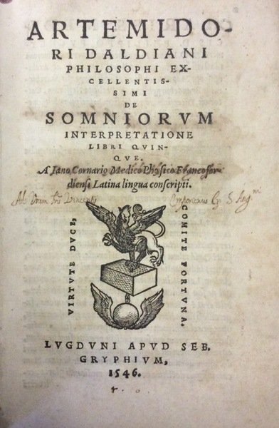 In-16 p. (mm. 158x100), p. pergam. molle coeva (piatto poster. restaur. per manc.), 296 pp.num.; marca tipografica xilografata al frontespizio, ornato da grandi capilettera figurati a vignetta pure inc. su legno. E' questo il più importante testo greco sull'interpretazione dei sogni.Artemidoro di Daldi in Lidia, scrittore greco (sec. 2° d.C.), nato a Efeso, ma che volle farsi chiamare di Daldi per dar onore al luogo di nascita della madre. Scrisse una spiegazione dei sogni (originariamente in due libri poi ampliati a cinque) di stile atticista e indirizzo stoicizzante. L'opera, che contiene per noi preziosi elementi folcloristici, fu popolare nel Rinascimento. Così Diz. Treccani,I, p. 667.Con lievi uniformi arross. interc. nel testo, altrimenti buon esemplare.