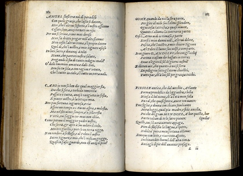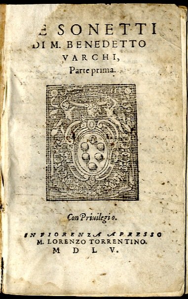 >in-8, pp. (16), 272, (24), carattere corsivo assai bello e inusuale. Legatura coeva in piena pergamena, titolo manoscritto al dorso. Piccola mancanza al frontespizio e alla seconda carta con perdita di alcune lettere. Il recto del frontespizio è interamente vergato da note antiche manoscritte pertinenti all'Autore. Una porzione della pergamena è stata abilmente restaurata, sguardie rifatte. Impresa tipografica al titolo con le armi dei Medici. Dedica a stampa dell'autore a "Francesco Medici Principe di Firenze". Edizione originale: "Rara edizione, che fa testo di lingua" (Morelli, Annali del Torrentino, p. 253-4). Solo nel 1557 il Torrentino pubblicò la parte seconda, con scarsa cura, come avverte il Morelli (op. cit. p. 299), datandola erroneamente 1554. Buon esemplare. (con varie finissime e leggere sottolineature a inchiostro chiaro). Buon esemplare. Gamba 1016: ''Raro''.