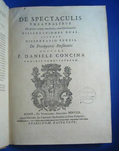 In-4° (26x19cm), pp. LVI, 376, legatura in tutta pergamena rigida coeva con titolo dorato su tassello al dorso. Tagli rossi. Frontespizio ed impresa tipografica in xilografia con cornice figurata inquadrante l'immagine di Cupido e il motto 'Soli Deo' entro cartiglio. Alla prima carta, testo latino e volgare di una lettera circolare di Benedetto XIV, datata 1° gennaio 1748, sulla tolleranza che la Chiesa accordava, di mala voglia, ai divertimenti e alle feste del Carnevale, fondata, dottrinariamente, su proposizioni dello Stapleton espressamente citate. Dedicatoria del Concina all'arcivescovo Andrea Majoral. Iniziali e cul-de-lampe istoriati su legno. 'Index Capitum', approvazioni ed errata alle pp. XLV-LVI. Altro indice alle pp. 363 e sgg. Bell'esemplare Prima edizione di queste tre dissertazioni ('De Publicis Spectaculis', 'Adversus Theatra nonnullorum Regularium tempore carnisprivii', 'De Presbyteris Personatis') contro le rappresentazioni teatrali e la loro presuta influenza corruttrice sui costumi. Il Concina (Clanzetto, San Daniele, 1707-Venezia, 1756) assunse l'abito domenicano a Conegliano e studiò in Austria e a Venezia, occupando poi una cattedra di filosofia e di teologia a Forlì. Poligrafo dalla zelante aderenza ai principi della Chiesa controriformata, oratore valente, ingaggiò asperrime polemiche con i Gesuiti in controversie teologali sul probabilismo che gli valsero gli attacchi, tra gli altri, di Sant'Alfonso de'Liguori, ma l'apprezzamento del pontefice. Cfr. Coulon, in Dictionnaire de théologie catholique, passim. Marcolin, Ateismo e deismo in Daniele Concina (1687-1756), pubblicazione della Facoltà di Magistero di Trieste, 1979-80.
