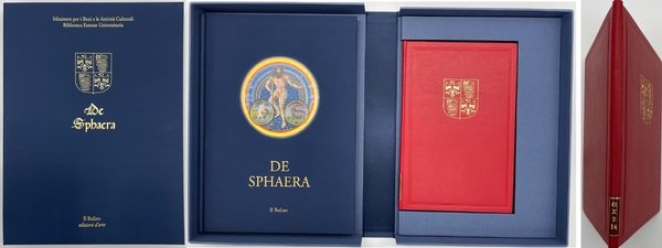 De Sphaera (Sphaerae coelestis et planetarum desriptio). Biblioteca Estense Universitaria, Modena (α.X.2.14 = Lat.209). Il Bulino 2010. Facsimile di uno dei più bei manoscritti miniati di astrologia (metà XV secolo). Il miniatore Christoforo de Predis rappresenta i diversi aspetti della vita quotidiana con scene che sono nell’ambito del tema principale: i pianeti. Legatura in pelle rossa con, sul primo piatto, lo stemma dei Visconti-Sforza. Formato 17x25. Pagine 32. Commentario, in italiano, a cura di Venturi Gianni, Bellingeri Luca, Lazzi Giovanna, Battini Annalisa, Bertozzi Marco, Incerti Manuela. Cofanetto di custodia in seta blu con impressioni in oro. Tiratura limitata e numerata di 950 copie. Condizione come nuovo