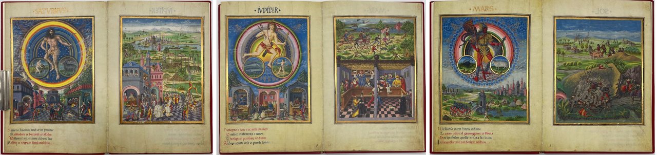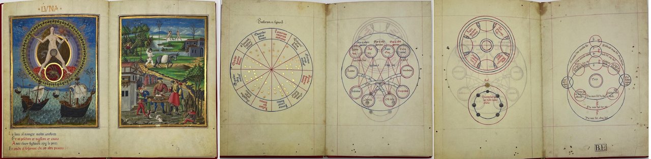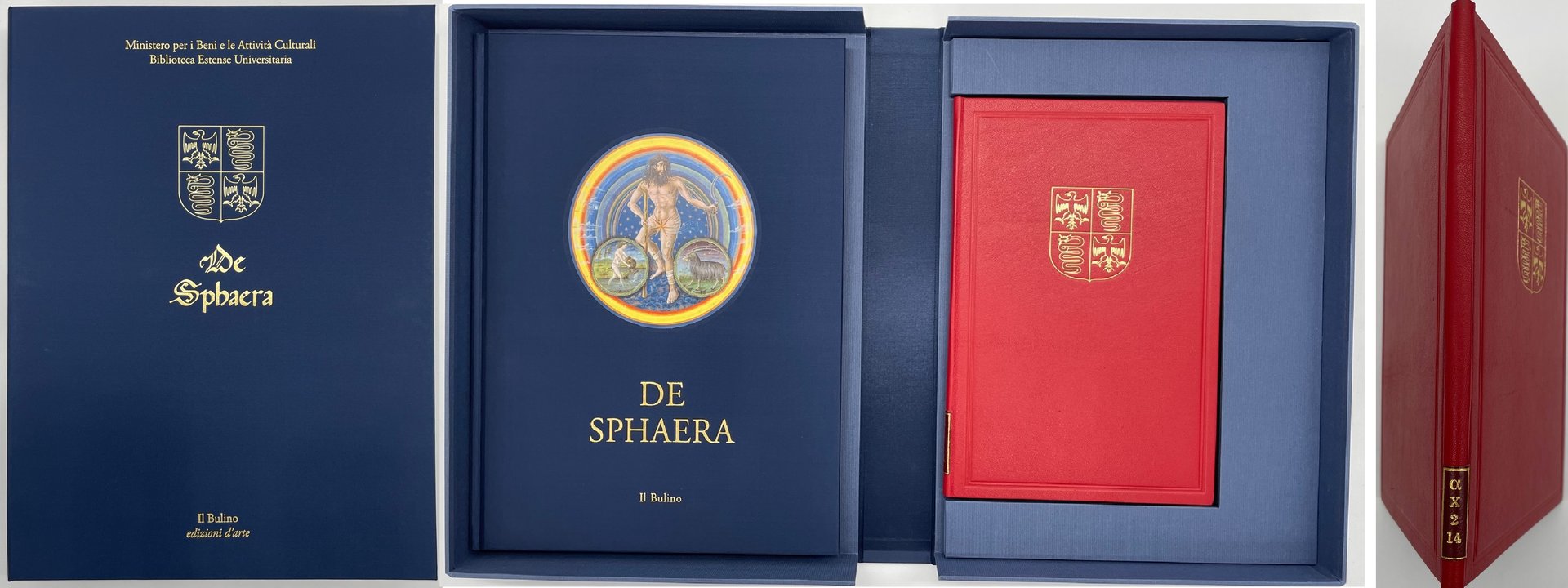 De Sphaera (Sphaerae coelestis et planetarum desriptio). Biblioteca Estense Universitaria, Modena (α.X.2.14 = Lat.209). Il Bulino 2010. Facsimile di uno dei più bei manoscritti miniati di astrologia (metà XV secolo). Il miniatore Christoforo de Predis rappresenta i diversi aspetti della vita quotidiana con scene che sono nell’ambito del tema principale: i pianeti. Legatura in pelle rossa con, sul primo piatto, lo stemma dei Visconti-Sforza. Formato 17x25. Pagine 32. Commentario, in italiano, a cura di Venturi Gianni, Bellingeri Luca, Lazzi Giovanna, Battini Annalisa, Bertozzi Marco, Incerti Manuela. Cofanetto di custodia in seta blu con impressioni in oro. Tiratura limitata e numerata di 950 copie. Condizione come nuovo.