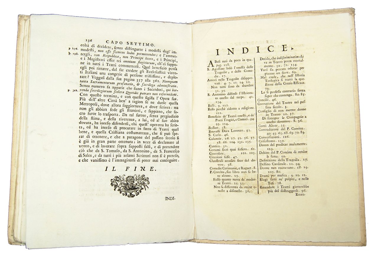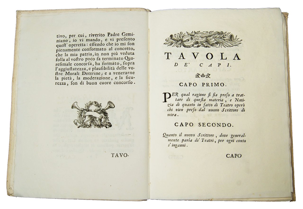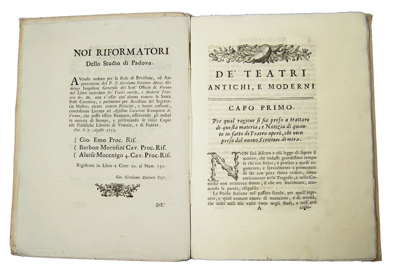 In-4° (248x180 mm), leg. coeva in cartonato alla rustica; pp. [8], 136, [4]. Vignetta xilografica al frontespizio. Iniziali, testatine e finalini xilografici. Prima edizione. L’opera è una risposta agli attacchi oscurantisti che il padre Daniele Concina aveva sferrato contro gli spettacoli teatrali, e in particolare contro l’autore. Rif.: IT\ICCU\UBOE\028294. Cond.: Esemplare fresco e con barbe, quasi in ottime condizioni.
