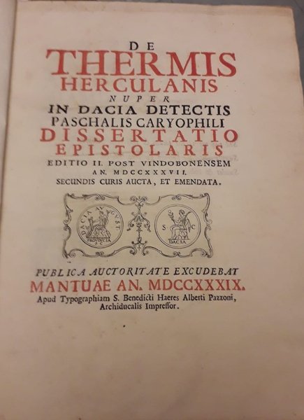 pp. 104 con decine di incisioni in rame e 1 grande xilografia nel testo. Unito a : Garofalo P: De usu ed praestantia thermarum Herculanarum…Mantuae-Pazzoni 1739. due opere (la seconda in prima edizione) rilegate in un volume in 4° gr. Cartoncino coevo. Splendido esemplare. Rarissime