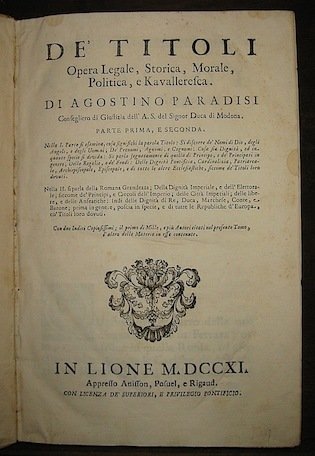 Folio (cm. 33,5), 18 cc.nn., 597(1) pp. Testo su due colonne. Bella legatura coeva in piena pergamena con nervi e titolo ms. al ds. Tagli azzurri. Le ultime tre carte con mancanza all’angolo inferiore che non interessano il testo. Ottimo esemplare. Edizione originale. Di estrema rarità. L’A. ricostruisce - attraverso un esame storico di grande erudizione concernente i Paesi europei - la nascita, l’uso e il valore giuridico dei titoli nobiliari, civili, cavallereschi e religiosi. Il presente volume fa parte della rarissima opera ‘Ateneo dell’uomo nobile.’ pubblicata a Venezia in cinque Tomi tra il 1704 ed il 1713. In particolare, solo queste due parti, che costituiscono il Tomo III, vennero stampate a Lione. Sempre in Venezia apparvero le parti terza e quarta che completano il terzo Tomo e trattano dell’Impero Ottomano e delle Monarchie e Repubbliche dell’Asia, dell’Africa e dell’America. Il volume qui descritto, pur essendo parte di un corpus più vasto, è da considerarsi in sè completo ed autonomo.