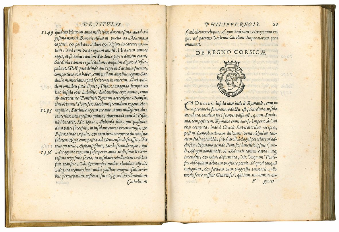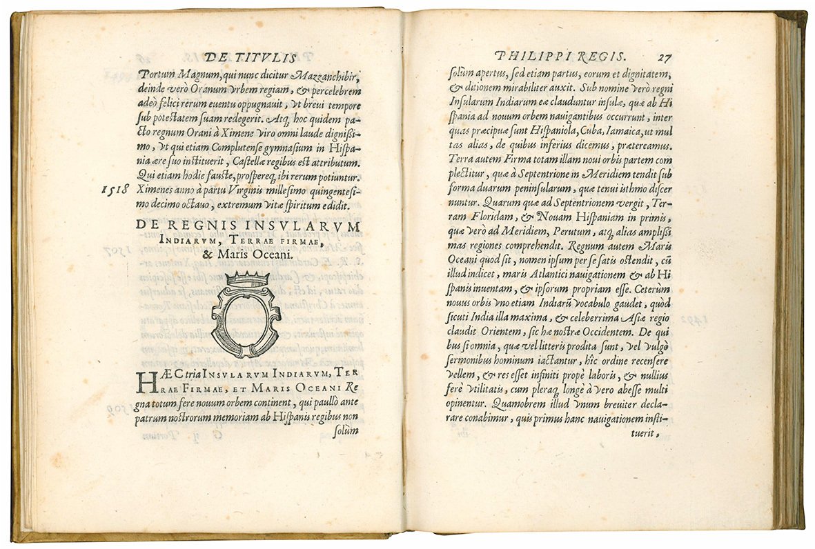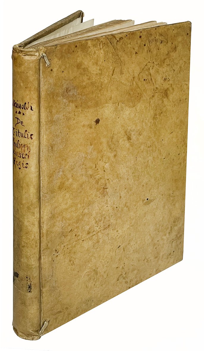 First edition. “Giacomo Mainoldi Gallarati, a member of a patrician family of Cremona, had a distinguished career as a jurist and office-holder in the Milanese dominion of Philip II, and at the end of his life was president of the senate of Milan. He was the author of De titulis Philippi Austrii liber, a survey of the medieval history of the imperial title and the modern domains of his sovereign. It was published in 1573 in Bologna, where Mainoldi was a student and where he resided in the home of Carlo Sigonio […] Sigonio mentions both father [Giovanni Battista] and son amongst those to whom thanks were due for the assistance in the preparation of De regno Italiae (1576). De titulis Philippi Austrii bears a certain resemblance in both the nature of contents and their organization to the anonymous Historiae tractatus composed circa 1570 by a student and boarder of Sigonio, the identification of whom with Giacomo Mainoldi Gallarati is here offered as a possibility” (W. McCuaig, Carlo Sigonio: the Changing World of the Late Renaissance, Princeton, NJ, 1989, p. 69; see also G.C. Ruginelli, Tractatus de senatoribus, Milan, 1697, pp. 37-38).