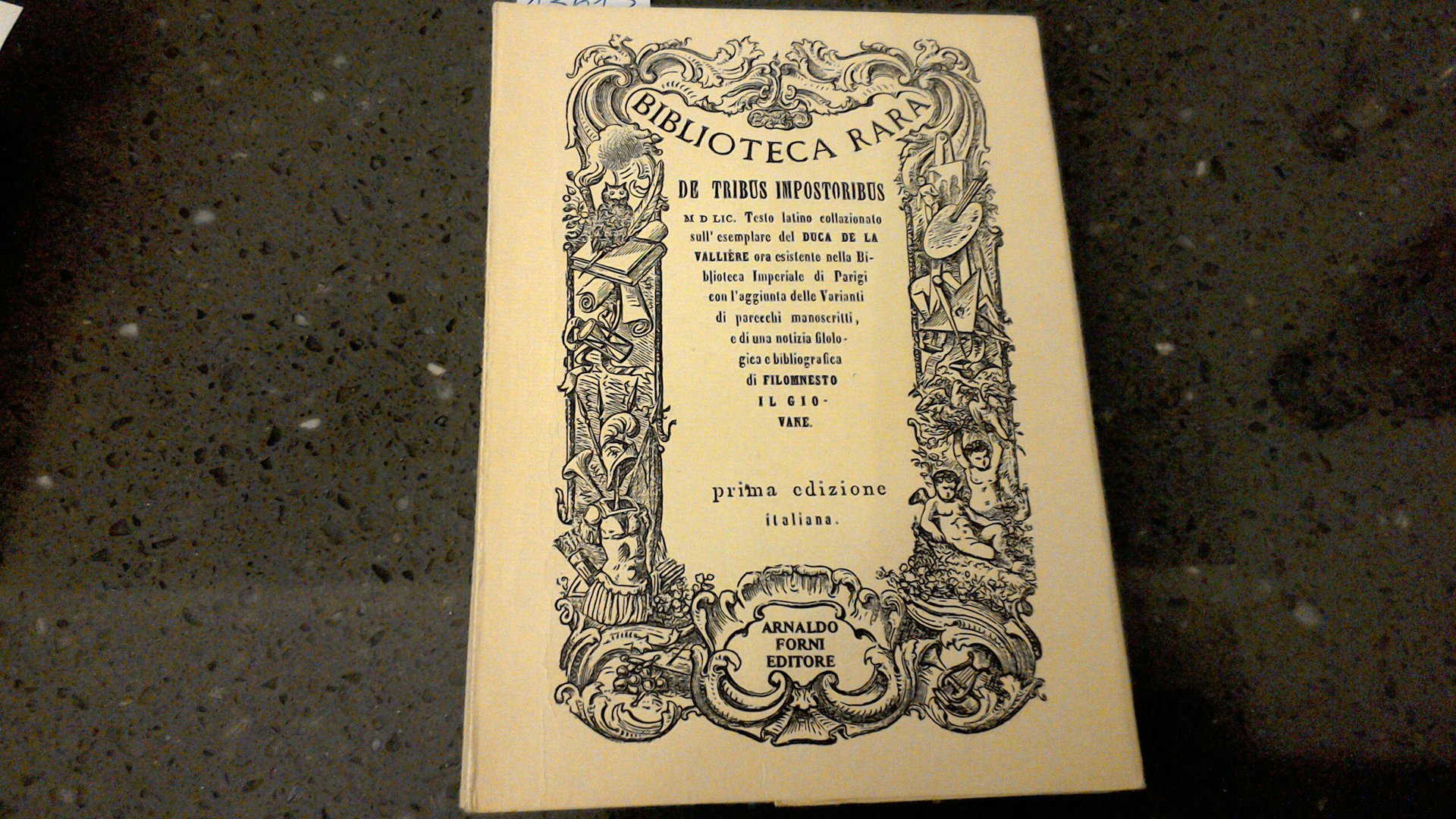 Testo latino collazionato sull'esemplare del Duca de la Valliere, con l'aggiunta delle varianti di parecchi manoscritti e di una notizia filologica e bibliografica di Filomnesto il giovane. Ristampa anastatica della prima edizione italiana del 1894.