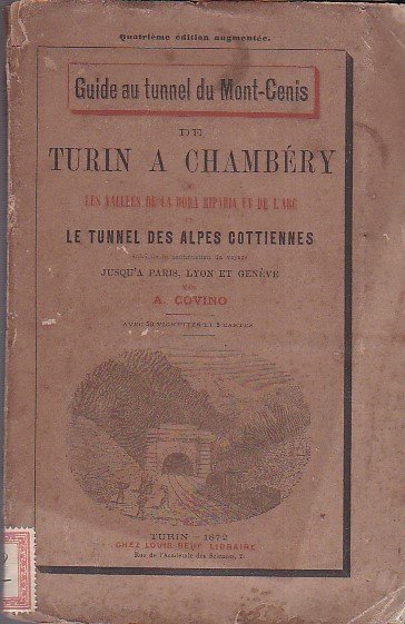 In-8° (190x123mm), pp. 195, (3), brossura editoriale marroncina con titolo in rosso e in nero e vignetta xilografica. 4 belle e dettagliate carte più volte ripiegate f.t. incise litograficamente: 'Vallée de la Dora Riparia', 'Traforo delle Alpi (al Colle di Frejus). Profilo e Piano geologico dei terreni attraversati dalla grande Galleria', 'Pianta di Torino. 1872', 'Vallée de l'Arc'. Numerose xilografie intercalate n.t. e f.t., alcune delle quali (del Moncenisio, di Bardonecchia) su doppia pagina n.t. Qualche ombra, alone e traccia d'uso alla brossura ma buon esemplare in barbe. Quarta edizione francese, aumentata rispetto alle precedenti, nella traduzione di Noemi Gachet. Vengono fornite minuziose notizie topografiche, storiche e statistiche e, inoltre, si ripercorre la storia della Galleria delle Alpi Cozie, illustrando in parallelo l'itinerario da Torino a Chambéry e vari itinerari ed escursioni alpine, venendo così a formare un'esaustiva guida della Maurienne, della Valle di Susa e della città di Torino. Il Covino, geografo ed alpinista piemontese, pubblicò parecchie guide di Torino e trattati storici e geografici (sul Covino cfr. De Gubernatis, Dizionario biografico degli scrittori contemporanei, p. 323). Manno, V, 21097/4. A.C.L., p. 78. Angelini, 909. Contributo cat. bibliogr. Valsusa, p. 127. Perret, 1156, in nota. Peyrot, Le Valli di Susa e del Sangone, 302. Peyrot / Gilibert, Valle di Susa, 301. S.A.C., pp. 408 e 490. B.N. C.A.I.