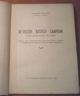 DE VECCHI BASTICO CAMPIONI - ULTIMI GOVERNATORI DELL'EGEO - (UOMINI - FATTI E COMMENTI NEGLI ULTIMI ANNI DI PACE E DURANTE LA GUERRA, SINO ALL'ARMISTIZIO CON GLI ANGLO-AMERICANI) - CON DEDICA AUTOGRAFA