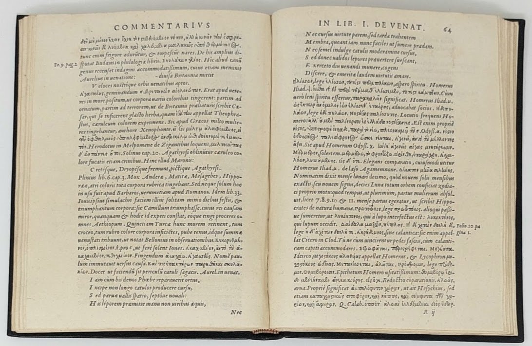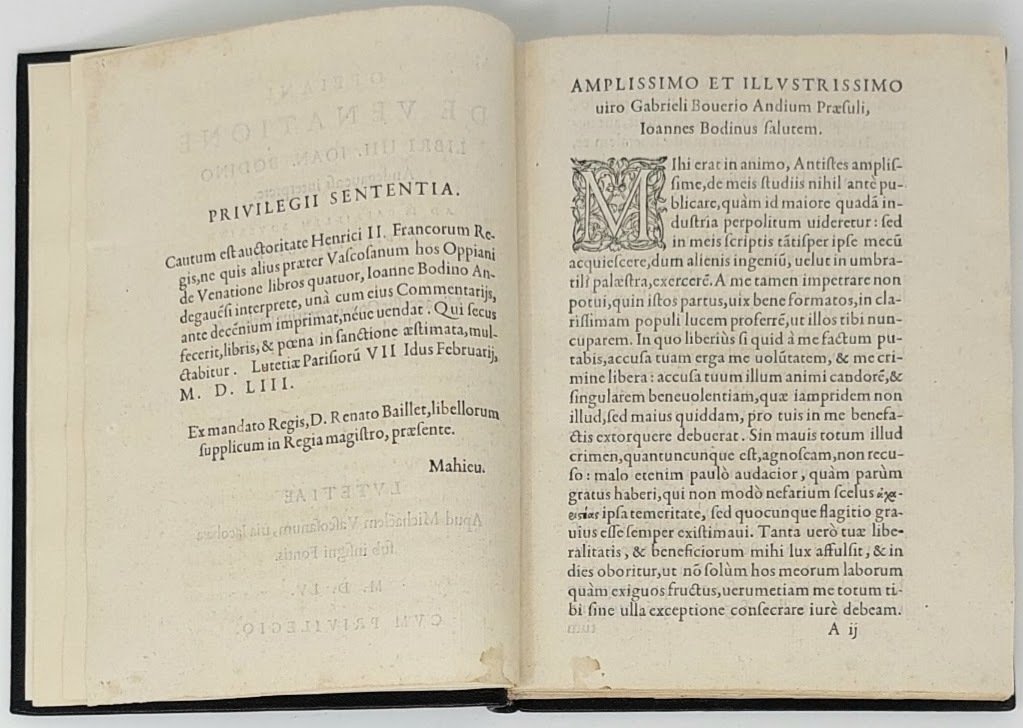 >in-4 (200x150 mm), ff. (4), 110 (ma i.e. 112 con i 2 ff. nn. inseriti dopo il f. 42), attraente legatura moderna in marocchino bruno con filetti a secco sui piatti, fleuron in oro al centro, dorso a nervi con fregio oro negli scomparti. Dedica del traduttore al vescovo Gabriele Boverio, iniz. silogr., testo in car. corsivo per l'Oppianus, in tondo, corsivo più piccolo e numerosi passi in greco per il commento. «Edizione originale, tipograficamente pregevole, rara, della traduzione latina di Jean Bodin» (Ceresoli p. 389). Com'è noto, l'opera di Oppiano (vissuto sotto il regno di Marco Aurelio o di Caracalla) tratta in 2100 esametri dei cani, dei mammiferi e degli uccelli, spesso con digressioni e credenze fantasiose. Di grande dottrina le spiegazioni di Jean Bodin, che alcuni studiosi ritengono copiate da quelle di Adrien Turnèbe. Ottimo esemplare, fresco (margine inferiore leggermente corto). Schwerdt II, 50. Souhart col. 358. Thiébaud 695.