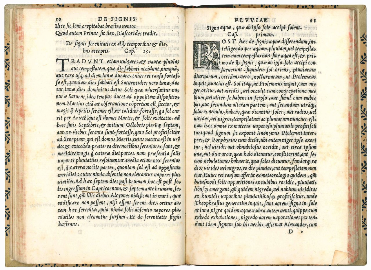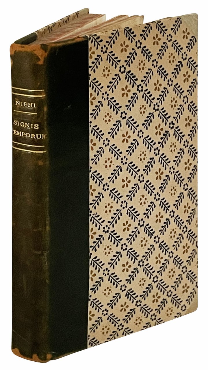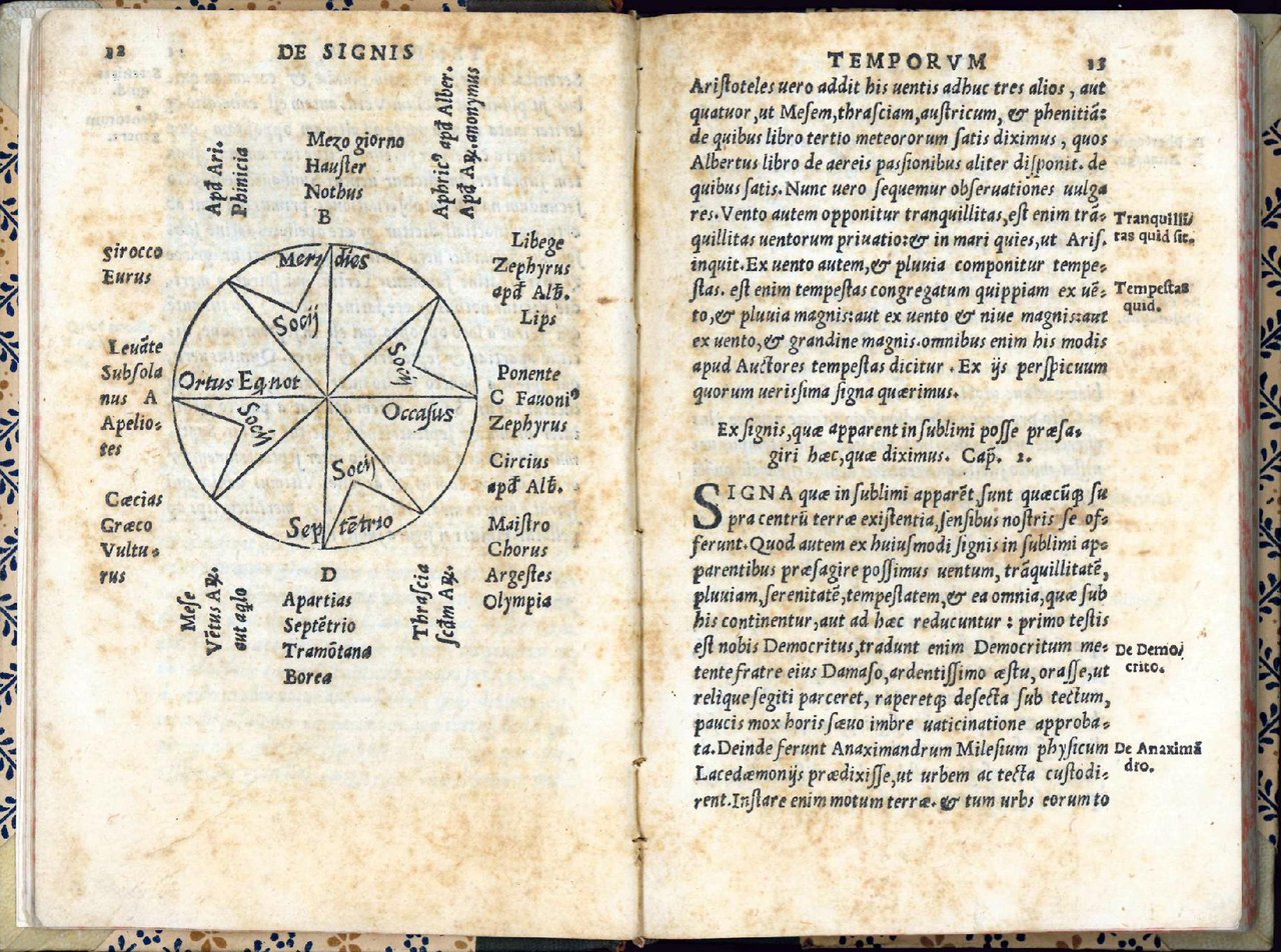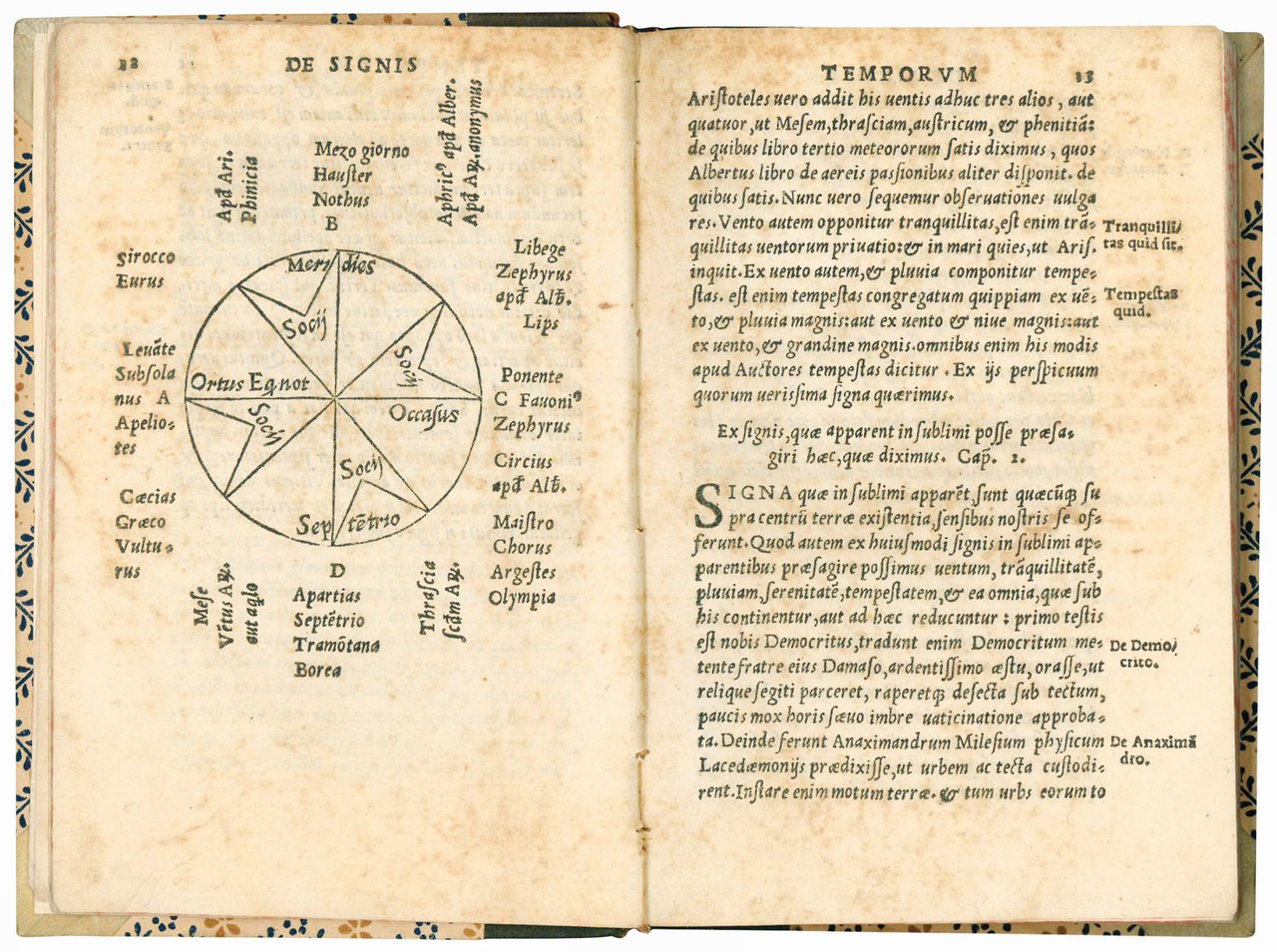 RARA PRIMA EDIZIONE di uno dei primissimi trattati dedicati integralmente alla meteorologia e alle previsioni del tempo, probabilmente il primo in assoluto ad opera di un autore italiano. L'opera si apre con una lettera del cardinale Pompeo Colonna al Nifo, contenente gli elogi dell'autore e della dedicataria del volume, ossia la marchesa del Vasto, Maria d'Aragona. Nella dedica vera e propria, di gusto allegorico-narrativo, il Nifo racconta a Maria di come egli, trovandosi a caccia in un bosco, s'imbatté in una figura femminile di grande bellezza che recava in una mano una cornucopia e nell'altra un ramoscello di palma (sembra richiamarsi in parte alla figura femminile assisa sul globo terracqueo raffigurata sul titolo). Questa gli chiese donde provenisse la sua tristezza ed egli le rispose che poc'anzi aveva visto volare dei corvi sulla sua testa, cosa che egli aveva interpretato come un segno di imminente maltempo. Al che ella gli rispose che solamente lei conosceva i secreti per interpretare i segni del tempo. Dietro le insistenze del Nifo perché glieli rivelasse, ella acconsentì a patto che egli li rendesse noti alla sola persona in grado di meritarli, ossia la Marchesa del Vasto. Il giorno seguente il Nifo si recò nel bosco, come convenuto, e vi trovò un libro intitolato De verissimis temporum signis. La ninfa era svanita.