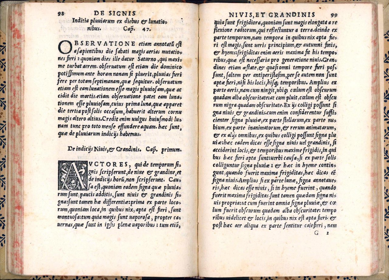 La prima parte dell'opera tratta del tempo in generale, la seconda, divisa in 25 capitoli, è dedicata ai segni del bel tempo, mentre i 45 capitoli della terza parte riguardano la pioggia. Seguono quindi De signis Nivis, et Grandinis (1 capitolo), De signis ventorum (25 capitoli), De signis Diluviorum (3 capitoli, in parte dedicati anche alle alluvioni e ai terremoti), e infine De signis Fertilitatis, atque Inopiae (3 capitoli sul problema dell'alternanza di fertilità e carestia).