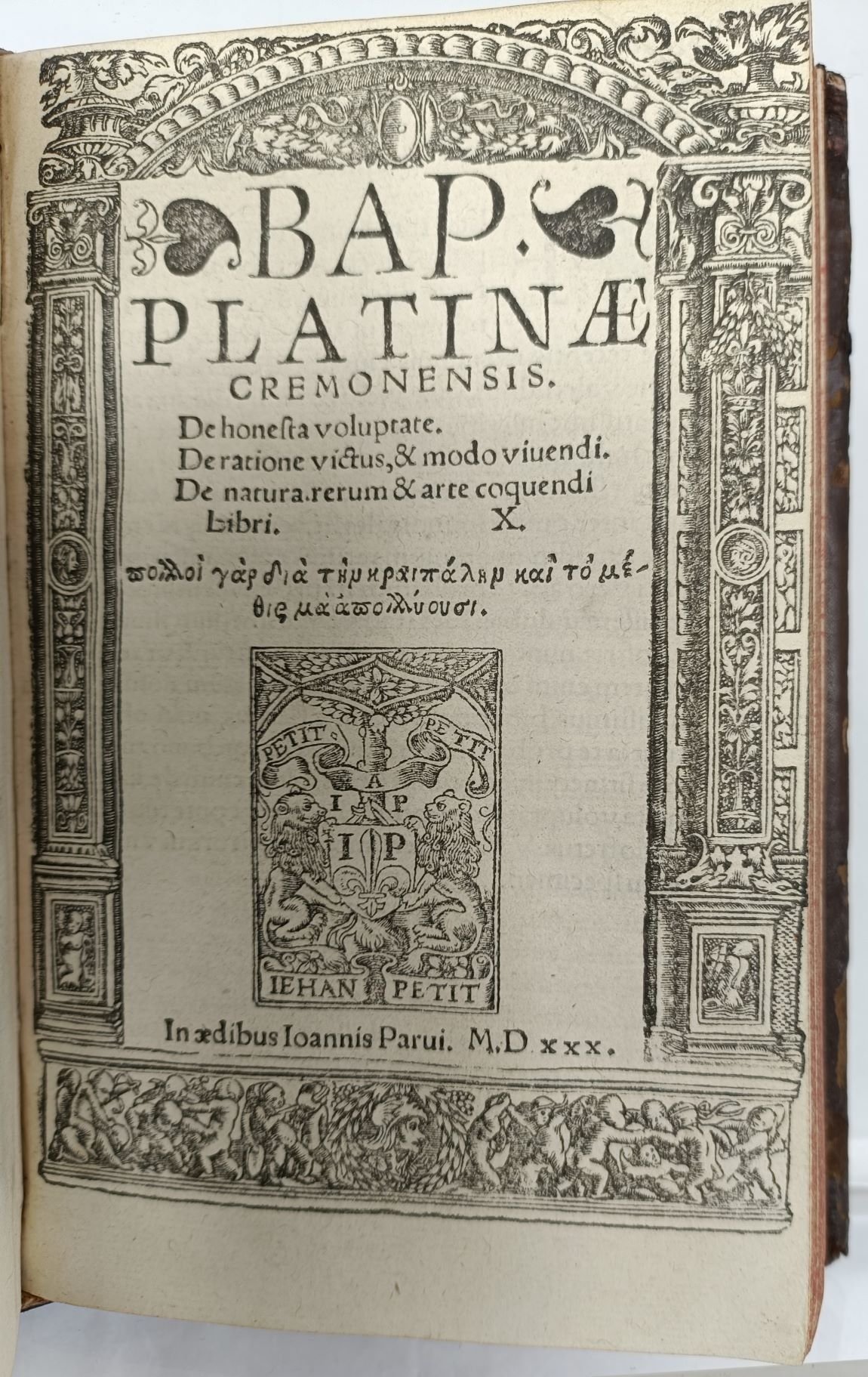 >3 opere in un vol. in-8, legatura del tempo piena pelle marrone, bordura con triplice filetto a secco sui piatti, dorso a nervi (alcune abrasioni poco visibili al cuoio la cuffia inferiore ottimamente restaurata, piccole mende agli spigoli), tagli rossi. Tutti e tre i titoli, con l'impresa tipografica, sono racchiusi nella medesima bordura ornamentale a motivo architettonico; grandi e piccole iniziali silografiche, testo in carattere tondo e note a stampa nei margini. Prima edizione della raccolta delle opere del Platina, il grande umanista e storico Bartolomeo Sacchi (1421- Roma 1481, detto Platina dal nome latino del villaggio ''Piadena'' in provincia di Cremona). I) ''De vita et moribus Summorum Pontificum'': ff. ccclxviii, (4). E' la celebre ''Storia dei Pontefici'', dedicata a Papa Sisto IV, tra i maggiori fondatori ed estimatori della Biblioteca Vaticana, della quale il Platina fu il primo bibliotecario.- II) ''De falso et vero bono dialogi. Contra amores. De vera nobilitatei. De optimo cive'': ff. cxxxvi. Sono dei trattatelli filosofico-morali in forma di dialogo. - III) ''De honesta voluptate. De ratione victus, etc.'': ff. xcviii, (2, di cui ultimo bianco). Composta attorno al 1460, è l'opera più nota del Platina, di grande curiosità ed interesse gastronomico, che tratta di ogni genere di commestibili, loro virtù , benefici o danni che possono arrecare al corpo; come cucinare vari tipi di vivande, salse e condimenti appropriati; quali luoghi siano adatti per l'abitazione, gli esercizi corporali, ecc. Il volume è piuttosto attraente, malgrado i margini non grandi, con la conseguenza che le tre bordure, larghe e impresse storte, risultano in qualche porzione del lato destro rifilate di 1-2 mm. BMC, French, 388 (sotto Sacchi). I) Adams P-1417. - II) Adams P-1407. - III) Adams P-1410. Vicaire 691. Simon, Bacchica II, n. 523.
