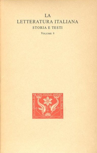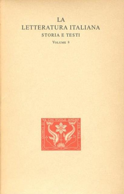 XVII, 1244 p. ; 22 x 14 cm. La letteratura italiana. Storia e testi. A cura di Enrico Bianchi, Carlo Salinari e Natalino Sapegno. Legatura editoriale in tela di colore marrone chiaro, con titolo impresso in oro su riquadro marrone al dorso, muto il piatto, sovraccoperta con alette. Custodia di cartoncino muto di colore marrone. Esemplare ottimo, solo alcune fioriture e piccole macchie al dorso della sovraccoperta. Codice libreria 543.