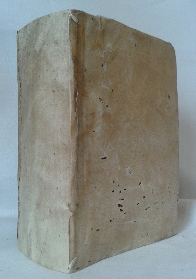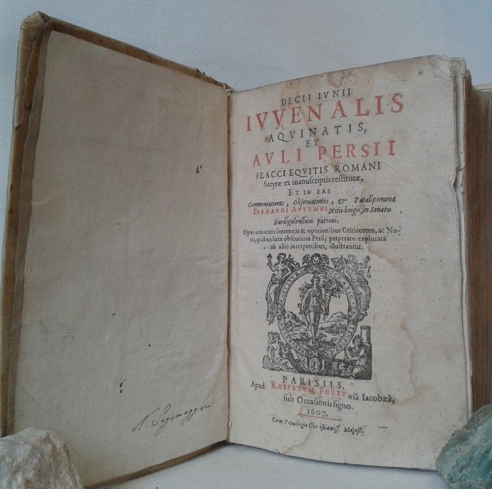 Volume in 8 legato in pergamena (dorso professionalmente rifatto), sguardie, frontespizio in rosso e nero con bella marca tipografica, 5 carte, 440 pp., frontespizio dell'Index omnium fere vocabulorum seguito da 27 carte, frontespizio delle satire di Persio, 199 pp., 10 carte d'indice e due biancge, occhiello delle 'Notae Bernardi Autumni Nitiobrigis, quibus loca obscuriora Persii, non satis explorata a Casaubono, illustrantur' di 22 pp., bianca, frontespizio de 'A. Persii Flacci Satirarum sex Liber Singularis', 7 carte, 288 pp., 8 carte d'indici, frontespizio delle 'Periphrases prope aenigmaticae' di 26 pp. seguito da tre carte con 'Hippocrati Coi de medicamentis purgantibus libellus'. Notevole edizione, con il corollario opimo dei commenti, delle satire di Persio e Giovenale, filologicamente corretta e di grande interesse per le notule e le glosse. Assai raro insieme, carta esente da bruniture, nerbata e greve. Una traccia di gora alle prime carte, qualche sporadica ed ininfluente menda d'uso, rare tracce di tarlo su alcune carte nei margini bianchi, annotazioni e richiami a pennino d'antica mano, in bello stato, importante secentina.