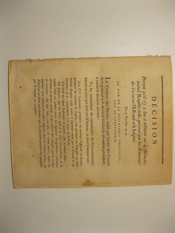 In 8, pp. 8. Br. rifatta. Decisione relativa alla memoria intitolata Requête civile considerata dal Conseil irricevibile. La presa venne annullata perche' fatta a meno di due leghe dalla costa di un paese neutrale. Cfr. Jurisprudence du XIX siecle, vol. 23. p. 36.