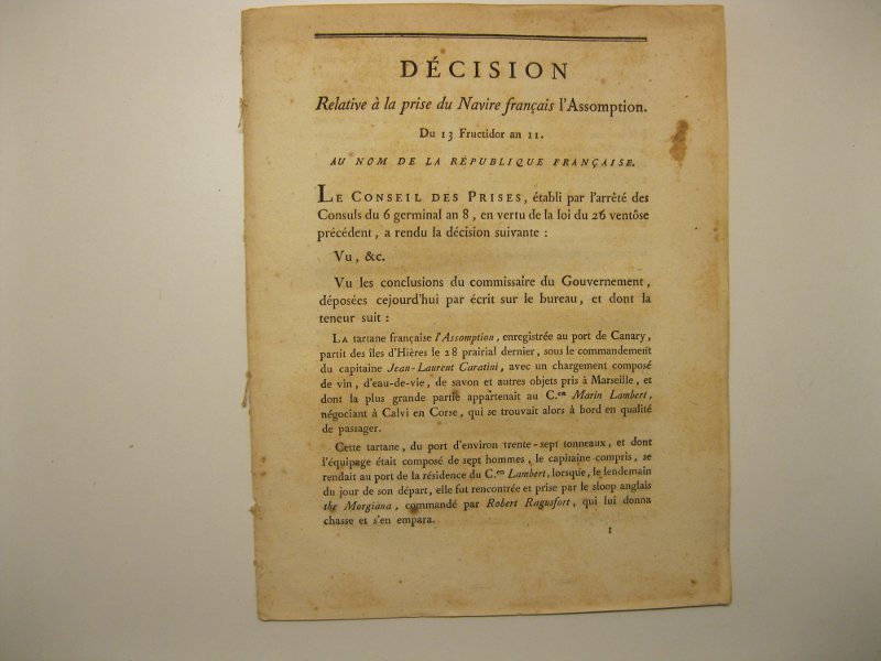 In 8, pp. 7 + (1b). Br. rifatta. Decisione del Conseil de prise relativa alla ripresa di una tartana francese gia' catturata dai corsari inglese e in seguito riconquistata dal capitano francese in seconda che era sbarcato in Corsica. Nella contesa si dibatteva se barca e carico si dovessero ridare all'armatore o al capitano in seconda. Il caso fece giurisprudenza, infatti si ritrova riportato in Repertoire universel et raisonne de jurisprudence, vol. 13. 1828.