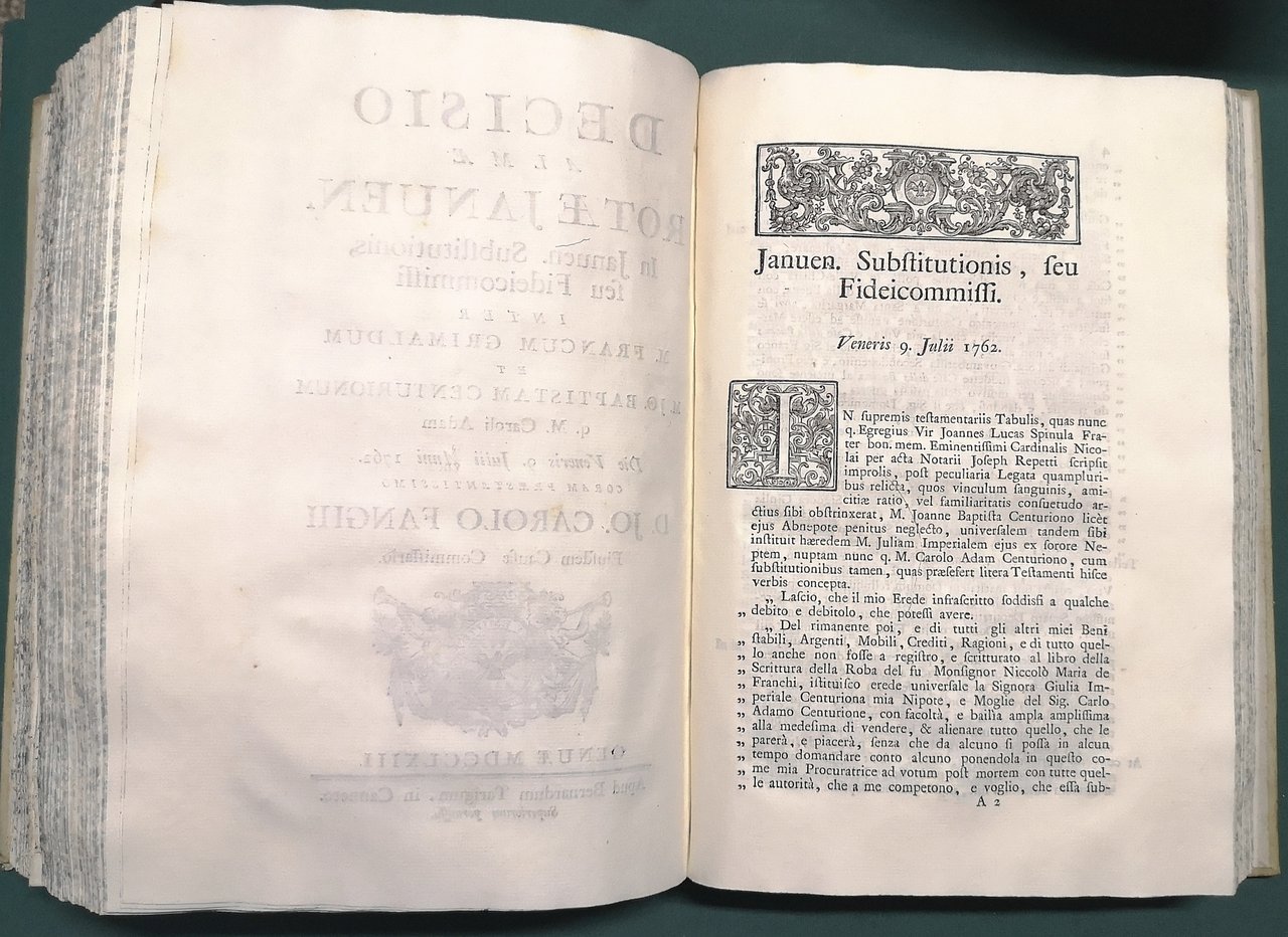 >in-4, leg. coeva p. perg. rigida, tagli spruzzati d'azzurro; contenente 48 sentenze del Tribunale, in latino o in italiano, per lo più su questioni di eredità legittima, assicurazioni e cambiali, emesse a seguito di cause civili tra vari cittadini della Repubblica. Sono quasi tutte stampate da Casamara, Scionico, Tarigo e Tip. Gesiniana, datate dal 1764 al 1776 e caduna ha dalle 8 alle 32 pp. Raccolta assai interessante per lo studio e la conoscenza della prassi giuridica di quel tempo in materia di eredità.