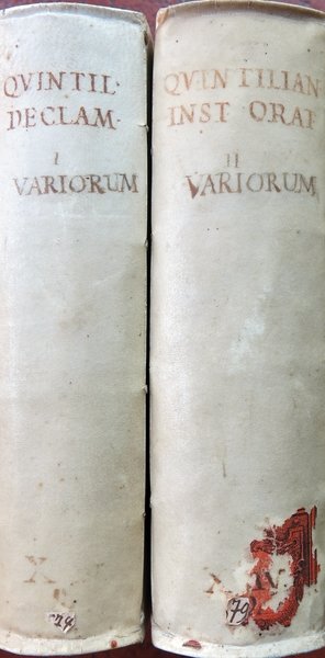 Declamationes cum Variorum Notis (M. Fab. Quintiliani Declamationes Undeviginti. M. Fabii Avi et Calpurnii Flacci Declamationes. Auctoris Incerti Dialogus De causis Corruptae Eloquentiae. Cum Variorum Notis) (e sotto si riporta Tomus II - forse un refuso di stampa). [con:] Institutiones Oratoriae (M. Fabii Quintiliani Institutionum Oratoriarum. Libri Duodecim. Summa diligentia ad fidem vetustissimorum codicum regogniti ac restituti. Accesserunt huic renovatae editioni. Declamationes, quae tam ex P. Pithoei, J. C. Clarissimi, quam aliorum Bibliothecis & editionibus colligi potuerunt. Cum Turnebi, Camerarii, Parei, Gronovii, & Aliorum Notis. Cum Indice locupletissimo, tam in Textum, quam Notas).